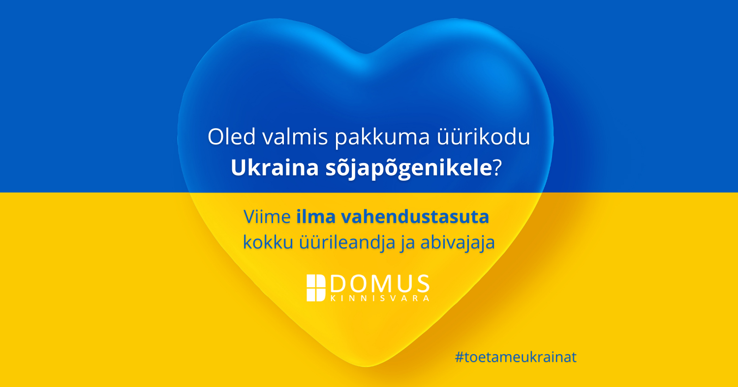Meieni jõuab üha rohkem abipalveid leidmaks üürikodusid Ukraina sõjast põgenenud inimestele. Kui Sa oled valmis mõistlikel tingimustel andma üürile korteri või maja Ukraina sõjapõgenikele, kirjuta meile aitame@domus.ee ja me viime abipakkuja ja abivajaja kokku ilma vahendustasuta!