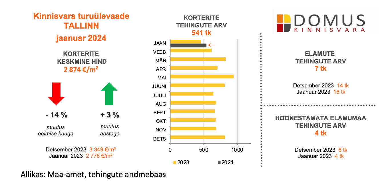 Jaanuaris müüdi Eestis kokku 1295 korterit, keskmise hinnaga 1911 €/m². Korterite tehingute arv võrreldes detsembriga langes 25% ja 2023. aasta jaanuariga võrreldes kasvas 2%. Müüdud korterite keskmine hind aastataguse ajaga on kasvanud ca 5%.