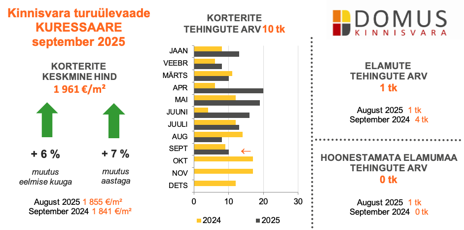 Kuressaare kinnisvaraturg näitas septembris 2025 positiivset liikumist. Toimus 10 korteritehingut ning keskmine hind tõusis 6% võrreldes augustiga ja 7% võrreldes eelmise aasta sama ajaga, ulatudes 1 961 euroni ruutmeetri kohta. Kuigi tehingute arv jäi tagasihoidlikuks, viitab hinnakasv sellele, et müügil olevad korterid paiknesid pigem uuemates või parema seisukorraga hoonetes.