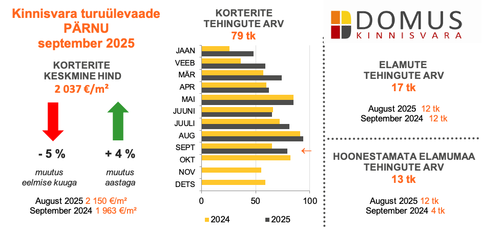 Pärnu kinnisvaraturg tegi septembris kerge pöörde jahtumise suunas. Toimus 79 korteritehingut, mille keskmine hind langes kuuga 5%, jäädes 2 037 euroni ruutmeetri kohta. Võrreldes eelmise aasta sama ajaga on hinnad siiski 4% kõrgemad, mis viitab turu üldisele tugevusele vaatamata lühiajalisele korrektsioonile. Aktiivsuse väike langus pärast suvehooaega on Pärnule tüüpiline, kui hooajaline nõudlus ajutiselt taandub.