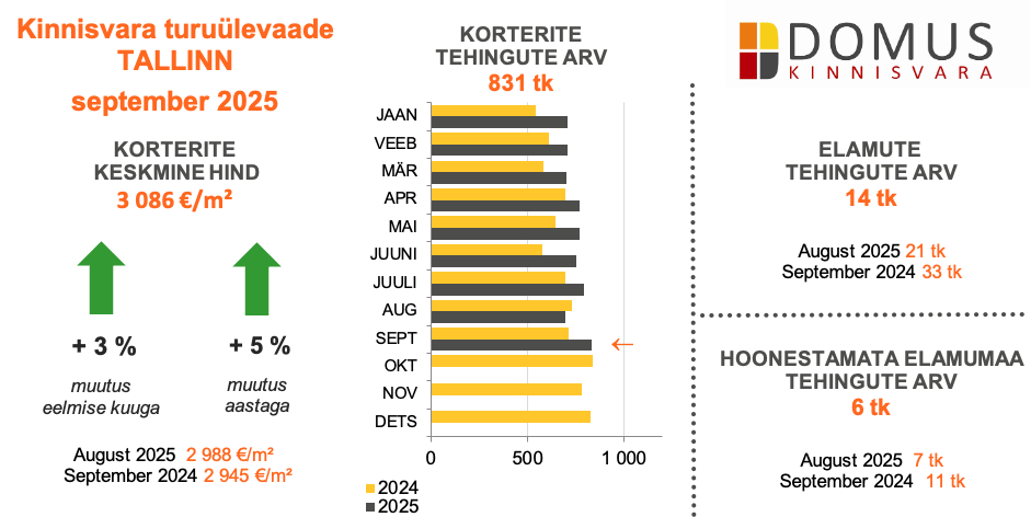 Septembris 2025 toimus Tallinnas 831 korteritehingut, mida oli rohkem kui eelmisel kuul. Korterite keskmine hind tõusis 3% võrreldes augustiga ja 5% võrreldes eelmise aasta sama ajaga, ulatudes 3 086 euroni ruutmeetri kohta. Hinnatõus koos kasvava tehinguaktiivsusega viitab elavnenud korteriturule sügishooaja alguses.
