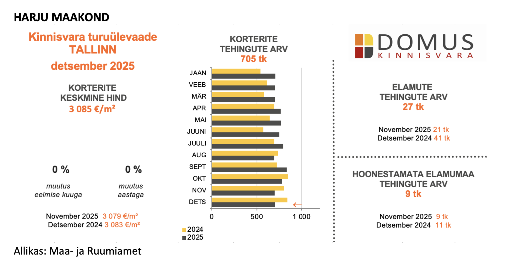 Eramute segmendis sõlmiti 27 tehingut, mis tähendab kasvu võrreldes novembriga, kuid jääb selgelt alla eelmise aasta detsembri tasemele. Hoonestamata elamumaa tehinguid oli 9, sama palju kui kuu varem, kuid vähem kui aasta tagasi. Kokkuvõttes iseloomustab Tallinna detsembrit rahulik ja ootav turuolukord: hinnad püsivad paigal, aktiivsus on hooajaliselt mõõdukas ning turg siseneb uude aastasse ilma selgete ülekuumenemise või languse märkideta.