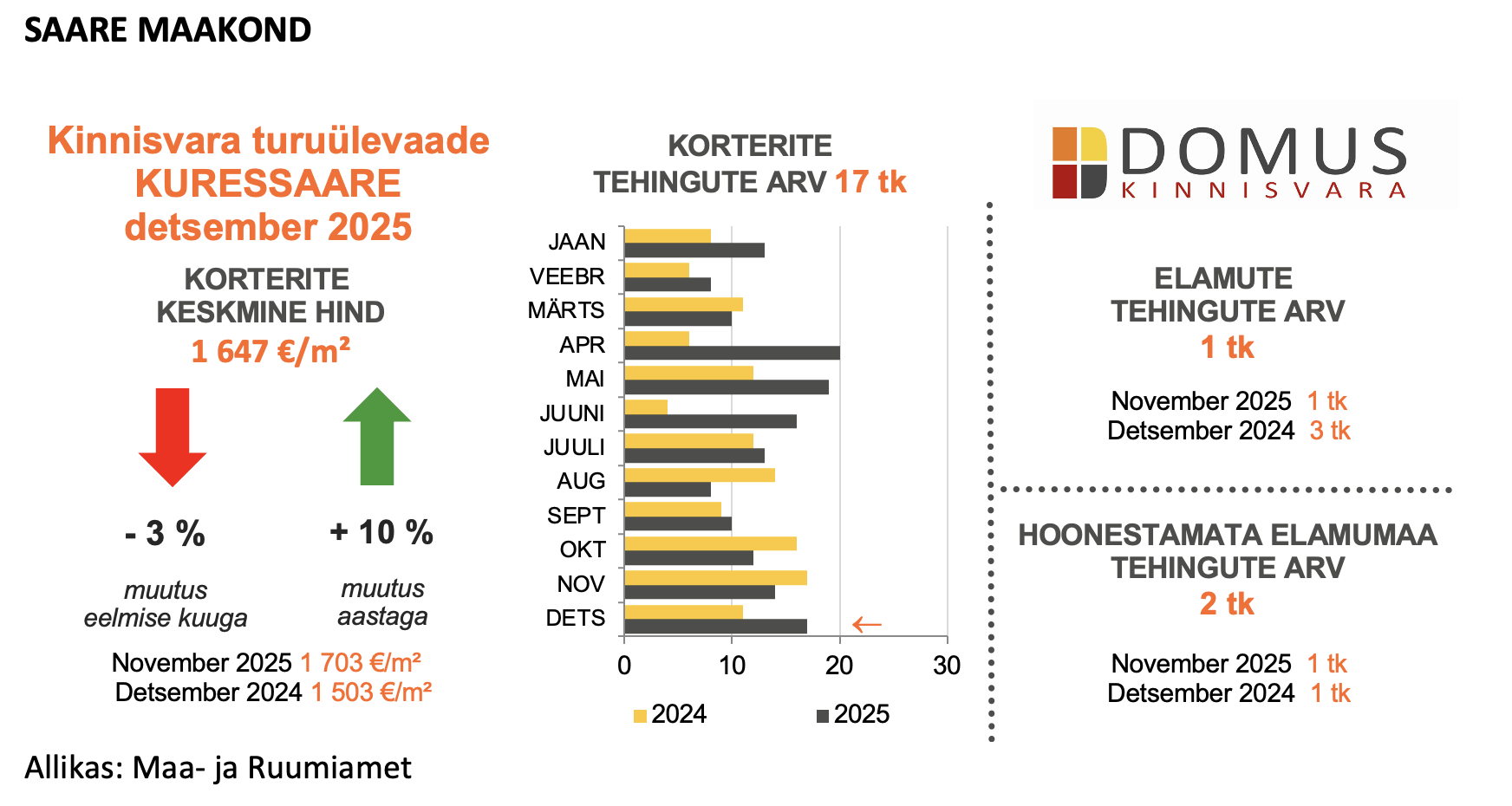 Kuressaare kinnisvaraturg lõpetas aasta mõõduka hinnakorrektsiooniga, kuid püsis aastavõrdluses tugev. Detsembris tehti 17 korteritehingut, mis on rohkem kui novembris ning viitab aktiivsuse kasvule. Korterite keskmine hind langes kuuga 3%, kuid jäi siiski 10% kõrgemaks kui aasta tagasi, ulatudes 1 647 euroni ruutmeetri kohta. Väikese turumahu tõttu võivad üksikud tehingud hinnataset kuude lõikes märgatavalt mõjutada.