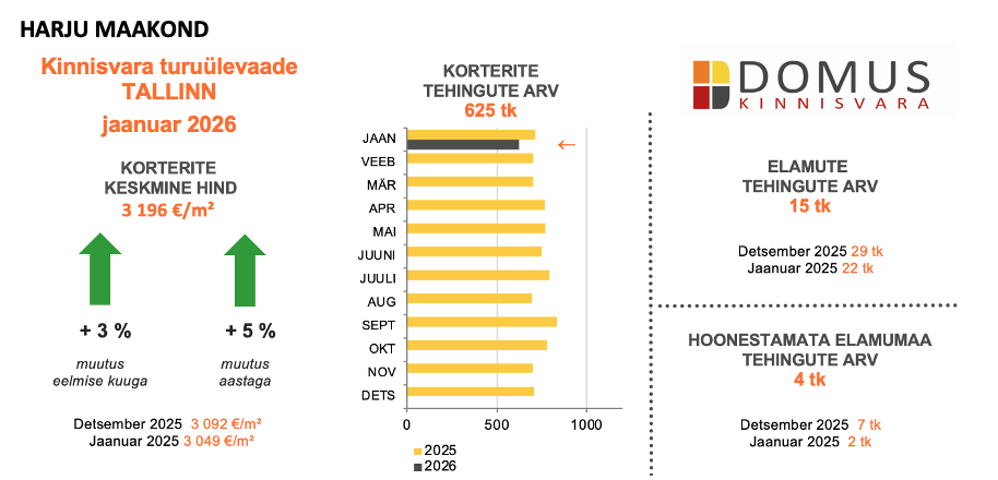 Tallinna kinnisvaraturg alustas 2026. aastat aktiivselt ja hinnatõusuga. Jaanuaris tehti 625 korteritehingut, mis on küll vähem kui detsembris, kuid vastab hästi hooajaliselt rahulikumale aasta algusele. Korterite keskmine hind tõusis kuuga 3% ja oli aastavõrdluses 5% kõrgem, ulatudes 3 196 euroni ruutmeetri kohta. See viitab sellele, et hinnasurve püsib ka pärast aasta vahetust ning turul ei ole toimunud märkimisväärset nõudluse taandumist.