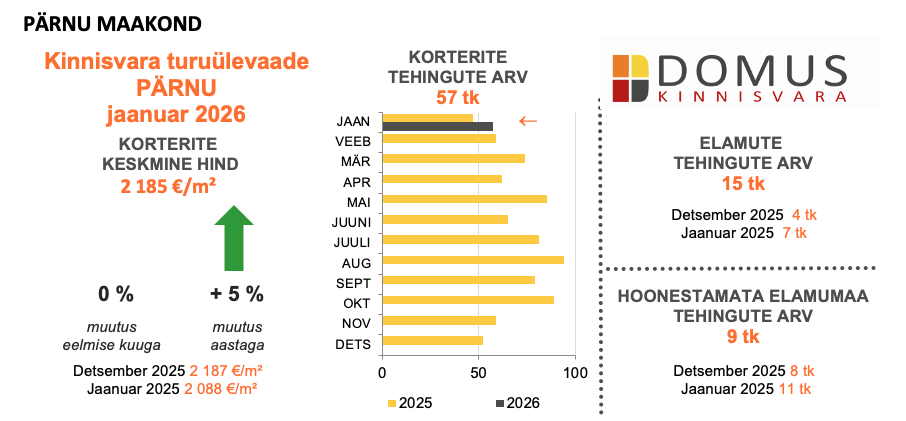 Pärnus oli hinnaliikumine stabiilne ning aktiivsus koondus pigem eramute segmenti. Väiksemates piirkondades, nagu Viljandi ja Kuressaare, olid hinnakõikumised järsud ja tehingumahud väikesed, mis rõhutab nende turgude suuremat volatiilsust. Kokkuvõttes alustas turg aastat tasakaalukalt: laiapõhjalist hinnalangust ei esinenud, kuid aktiivsuse kasv eeldab tõenäoliselt kevadhooaja saabumist.