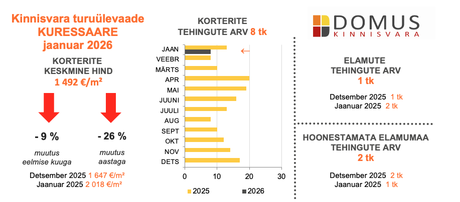 Kuressaare kinnisvaraturg alustas 2026. aastat selges jahtumises. Jaanuaris tehti vaid 8 korteritehingut, mis on vähem kui detsembris ning peegeldab väga madalat aktiivsust aasta alguses. Korterite keskmine hind langes kuuga 9% ja oli koguni 26% madalam kui aasta tagasi, jõudes 1 492 euroni ruutmeetri kohta. Nii järsk hinnalangus on väikese tehingumahu juures eeskätt statistiline ning viitab tehingute struktuuri muutusele, mitte laiapõhjalisele hinnalangusele.
