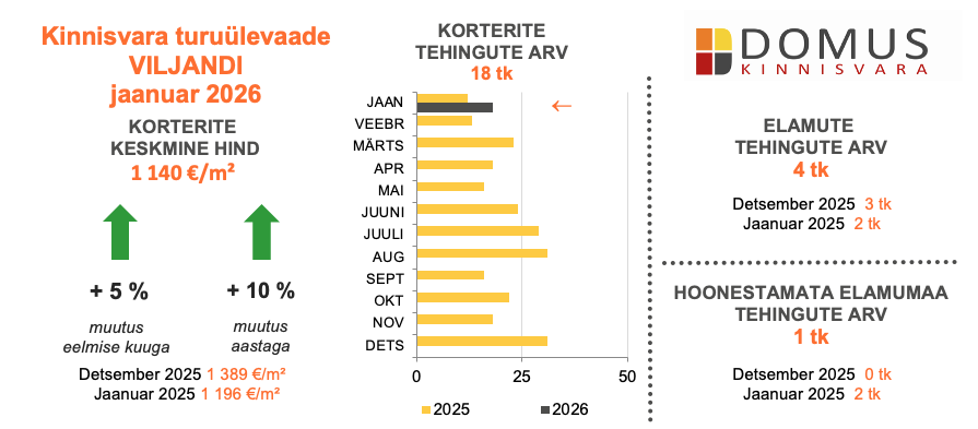 Viljandi kinnisvaraturg alustas 2026. aastat rahulikumas tempos. Jaanuaris tehti 18 korteritehingut, mis on märgatavalt vähem kui detsembris ning peegeldab hooajalist aktiivsuse langust pärast aasta lõppu. Korterite keskmine hind tõusis siiski kuuga 5% ja oli aasta lõikes 10% kõrgem, ulatudes 1 140 euroni ruutmeetri kohta. Hinnatõus väikese tehingumahu juures viitab eeskätt tehingute struktuurile, mitte turu üldisele hinnakasvule.