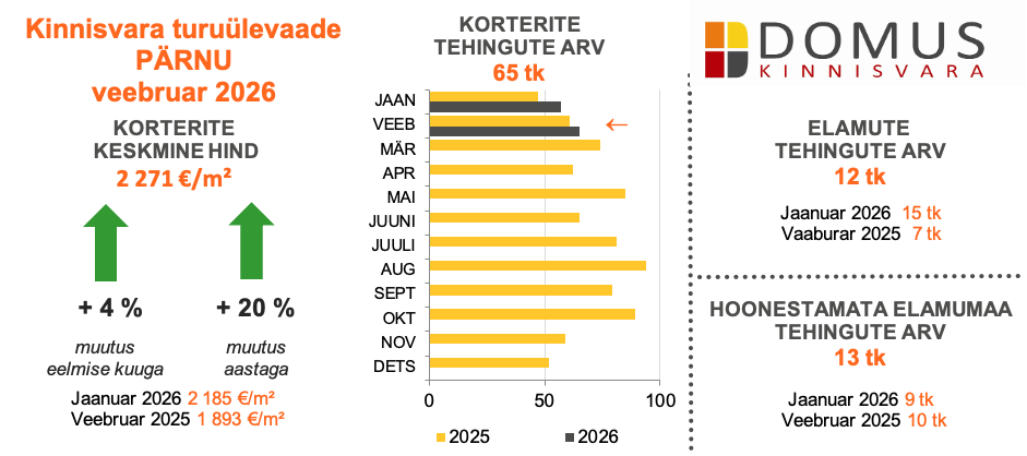 Pärnu kinnisvaraturg näitas veebruaris hinnataseme tugevat kasvu. Korterite keskmine hind tõusis kuuga 4% ning oli aasta võrdluses koguni 20% kõrgem, ulatudes 2 271 euroni ruutmeetri kohta. Korteritehinguid tehti 65, mis on rohkem kui jaanuaris ning viitab aktiivsuse mõõdukale kasvule pärast aasta alguse rahulikumat perioodi.