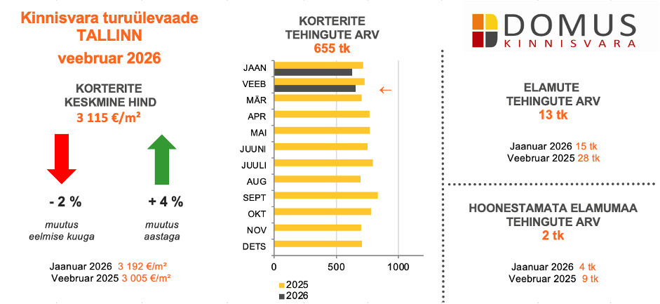 Tallinna kinnisvaraturg näitas veebruaris mõõdukat hinnakorrektsiooni. Korterite keskmine hind langes kuuga 2%, ulatudes 3 115 euroni ruutmeetri kohta, kuid jäi aasta võrdluses siiski 4% kõrgemaks. Korteritehinguid tehti 655, mis on veidi rohkem kui jaanuaris ning viitab aktiivsuse kergele kasvule pärast aasta alguse rahulikumat perioodi. Hinnalangus koos tehingute arvu suurenemisega viitab pigem tehingute struktuuri muutusele kui nõudluse vähenemisele.