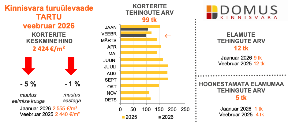 Tartu kinnisvaraturg näitas veebruaris mõõdukat jahtumist nii hinnatasemes kui ka tehinguaktiivsuses. Korterite keskmine hind langes kuuga 5%, jõudes 2 424 euroni ruutmeetri kohta, ning jäi aasta võrdluses 1% madalamaks. Korteritehinguid tehti 99, mis on vähem kui jaanuaris, kuid püsib siiski suhteliselt tugeval tasemel. See viitab sellele, et hinnalangus ei tulene nõudluse kadumisest, vaid pigem tehingute struktuuri muutusest ning võimalikust ostjate ettevaatlikkusest kõrgemate hinnatasemete juures.