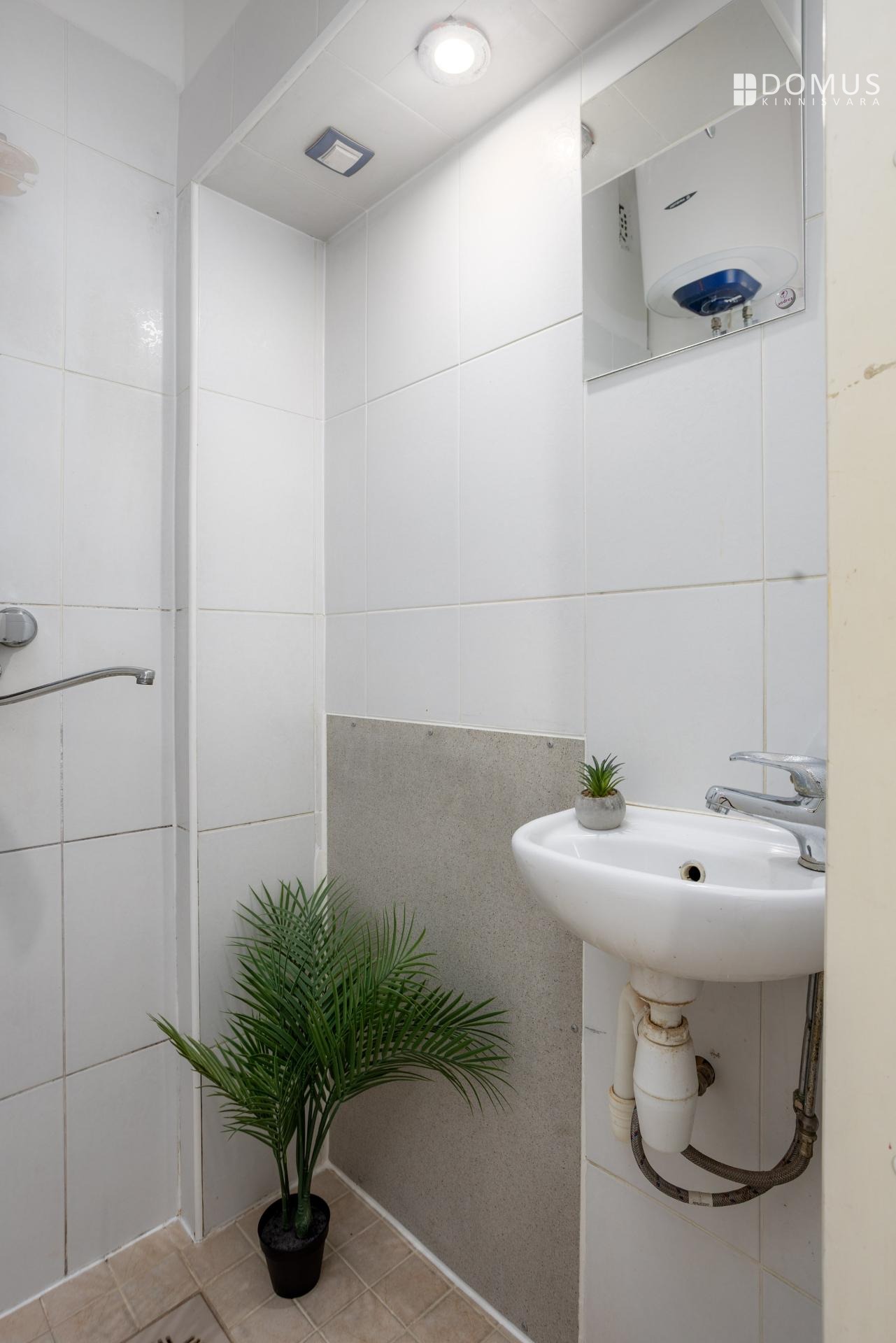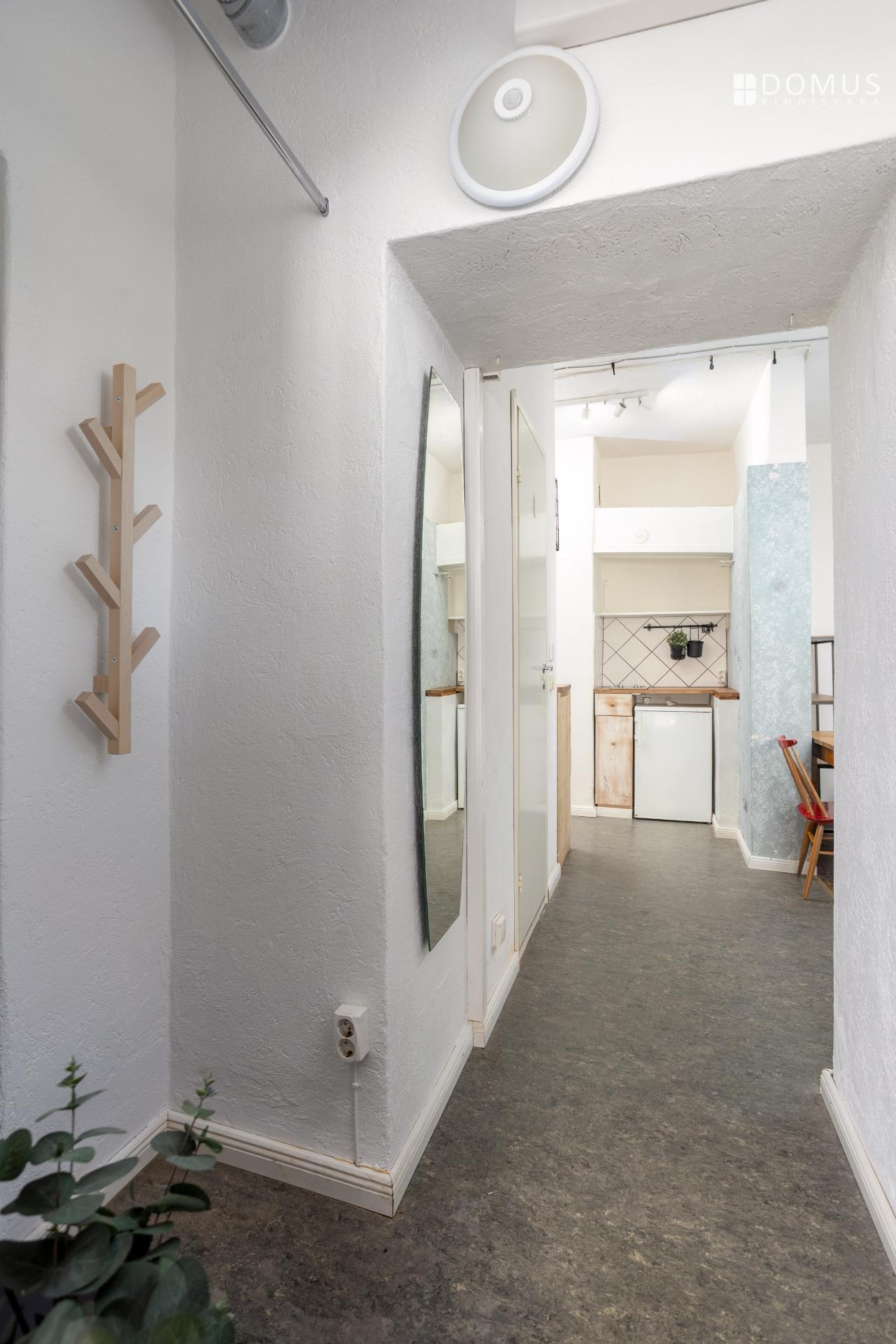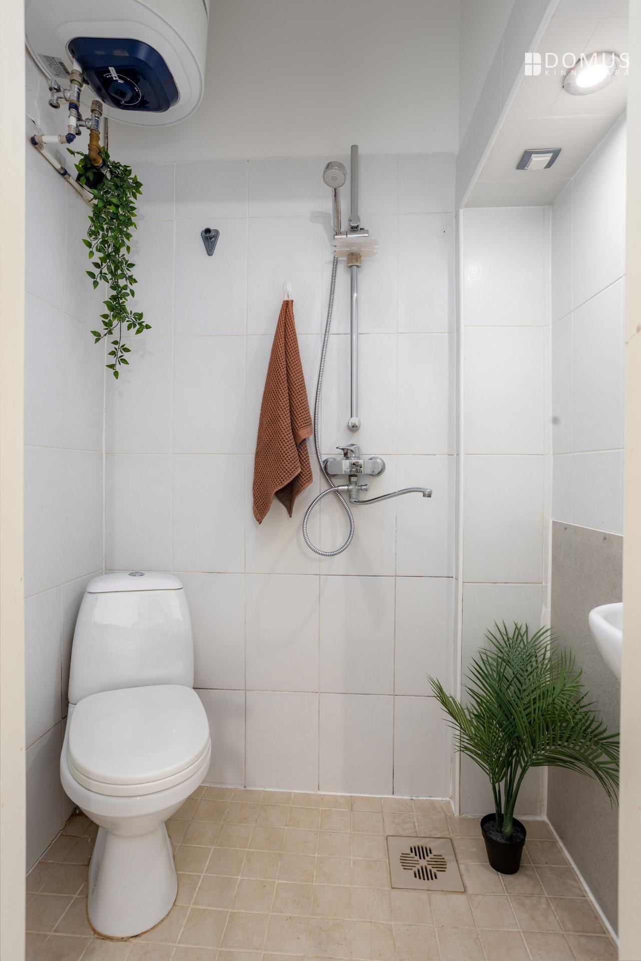 Upon entering the apartment, you arrive in a small hallway with space for outerwear and shoes. To the left is a compact bathroom, and next to it a kitchenette.