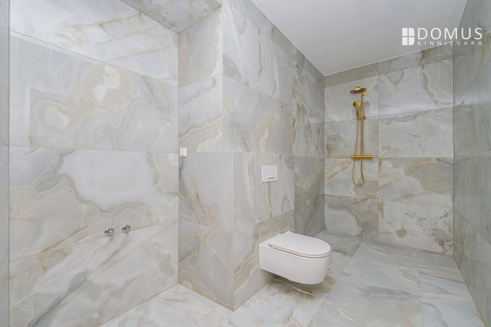 The apartment includes water-based underfloor heating connected to district heating, apartment-specific ventilation with heat recovery, digital temperature sensors in all rooms for heating and ventilation control, triple-glazed wooden windows, and a Villeroy & Boch O.Novo wall-hung toilet.