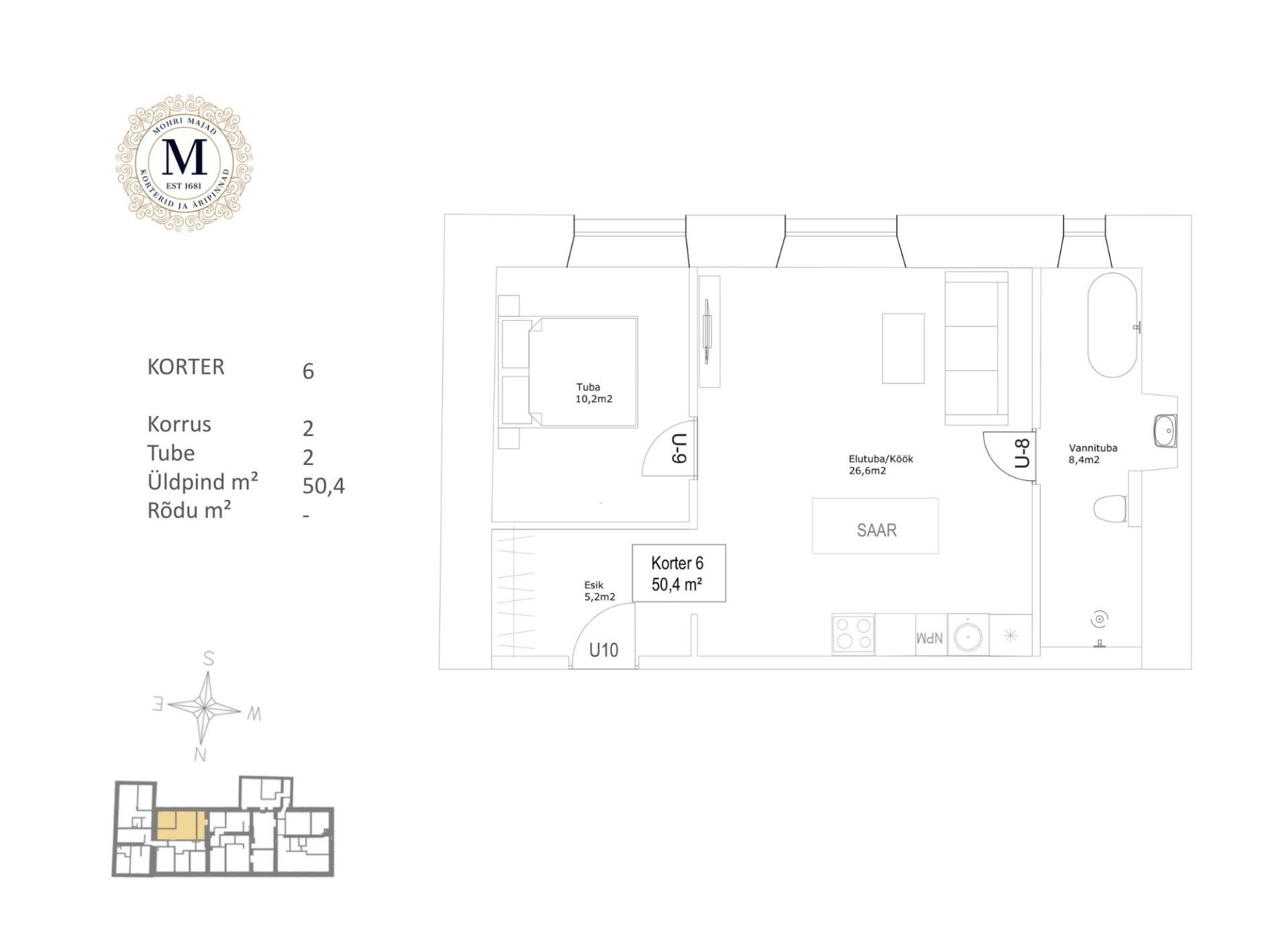 The apartment for sale is a 2-room unit with a size of 50.4 m², located on the 2nd floor.