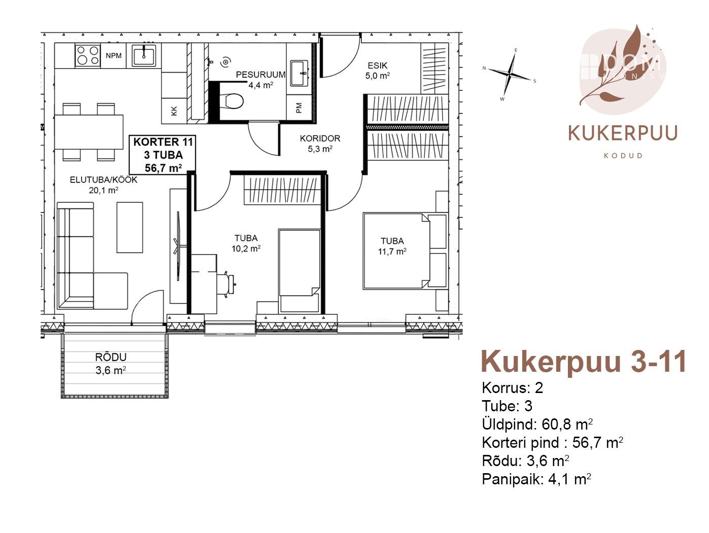For sale apartment, 3 room - Kukerpuu tn 3-11, Raadi alev, Tartu vald, Tartu maakond