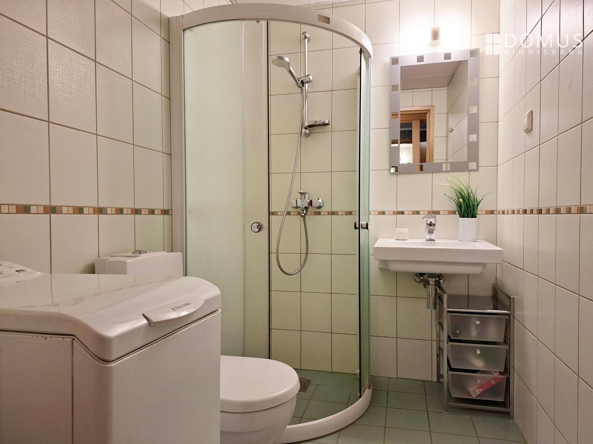 washing machine, furniture, parquet, refrigerator, shower