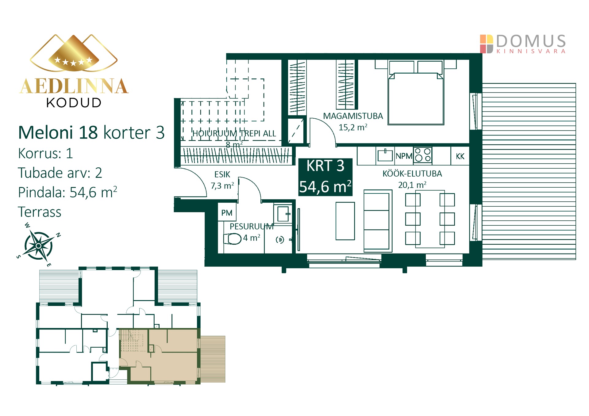 The total area of the apartment is 54.6 m², designed with practicality and comfort in mind. The bright and open kitchen-living room (20.1 m²) forms the heart of the home, complemented by a generously sized bedroom (15.2 m²). The entrance hall (7.3 m²) is spacious and features a practical 8 m² storage area under the stairs, providing valuable extra room. A 4 m² bathroom with toilet and shower completes the functional layout.