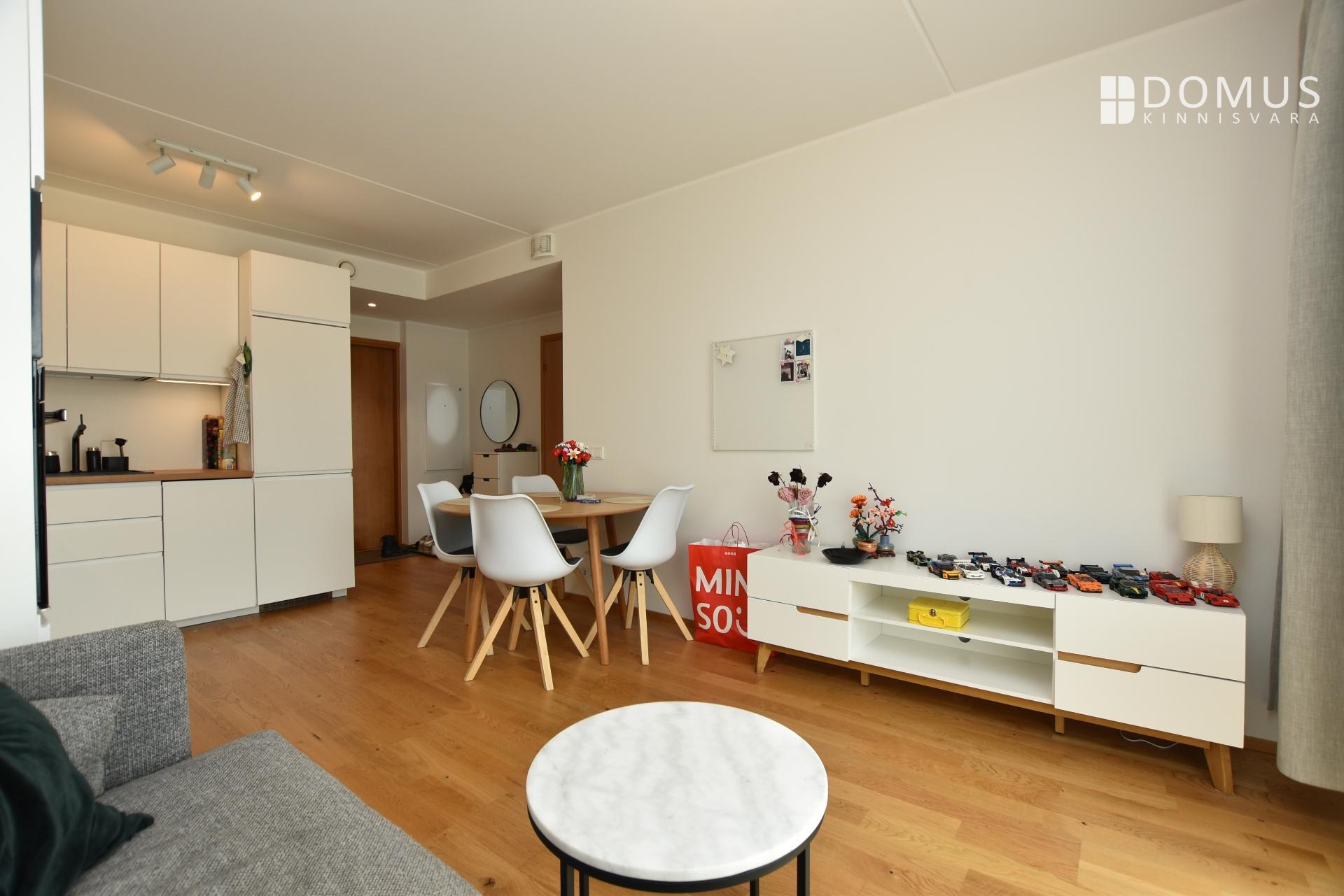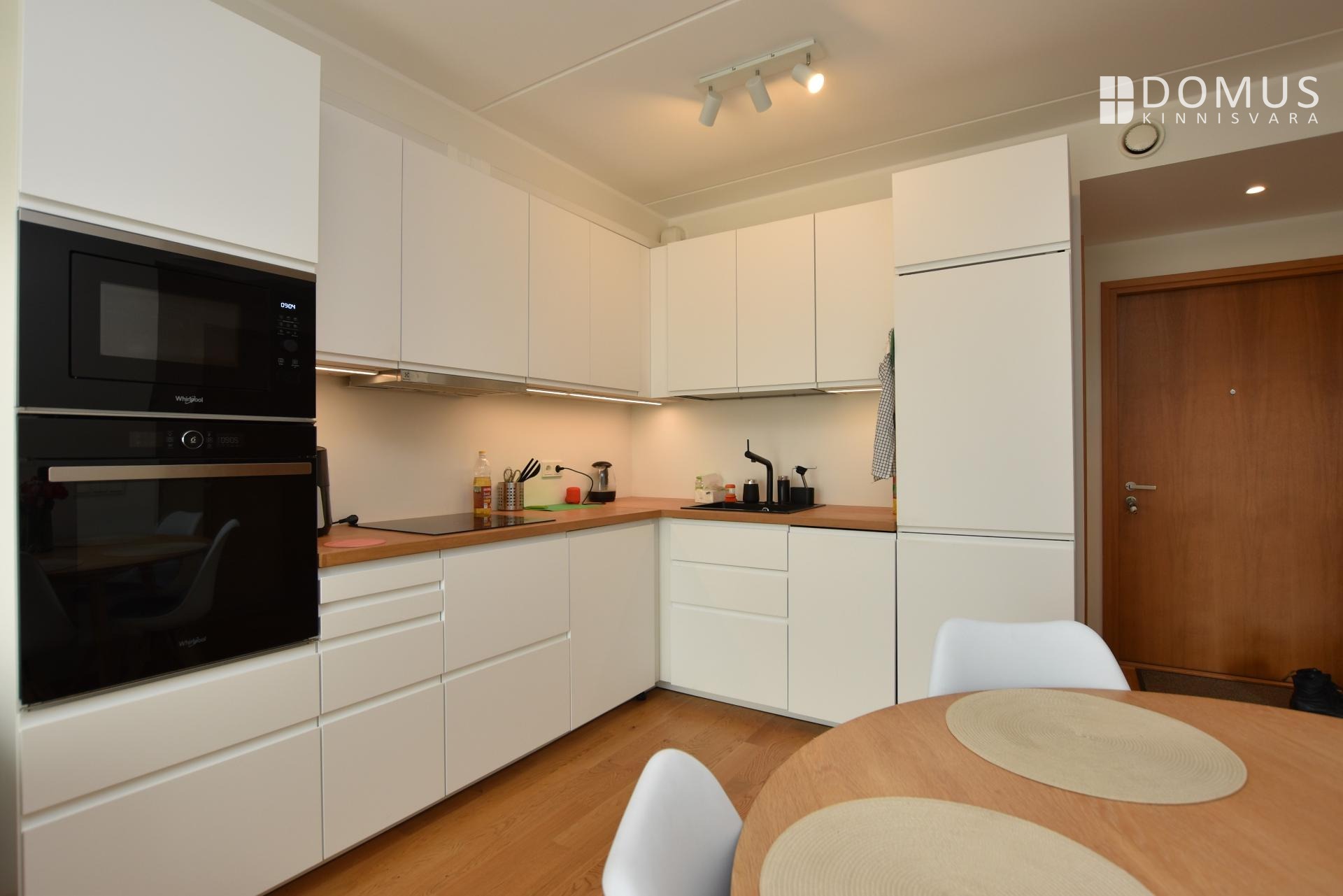 The apartment is located on the 3rd floor of a five-storey building. The layout is well thought out and comfortable – a spacious living room with an open kitchen, a separate bedroom with a built-in wardrobe, a bathroom with a shower, an entrance hall and an in-apartment storage room. The kitchen is equipped with furniture and appliances, including a dishwasher. The windows face the courtyard.