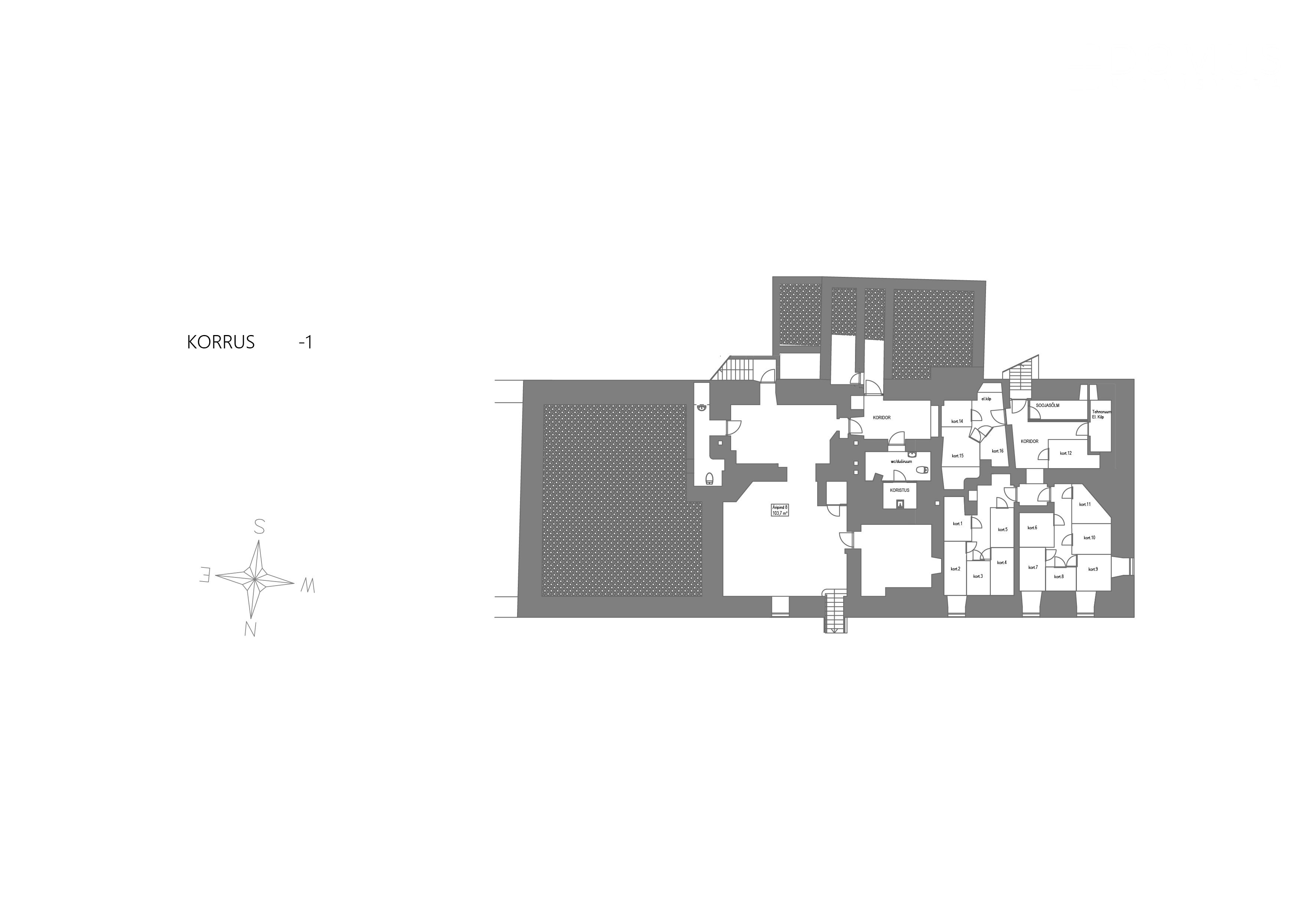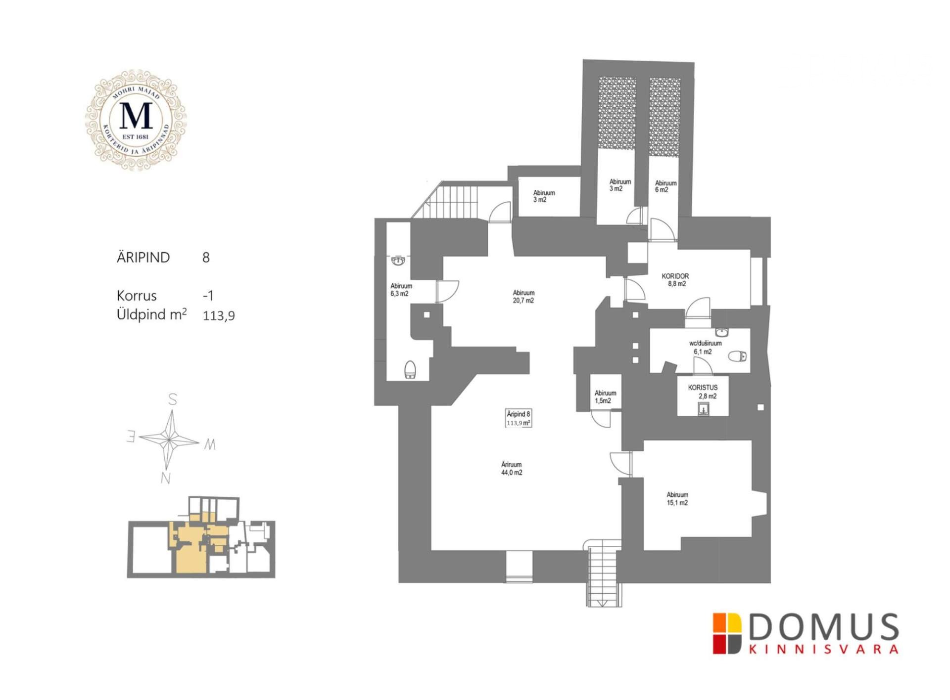 The commercial unit for sale, Unit No. 8, has an area of 115.6 m² and is located on the basement level (-1), featuring a very convenient direct entrance from Rüütli Street.