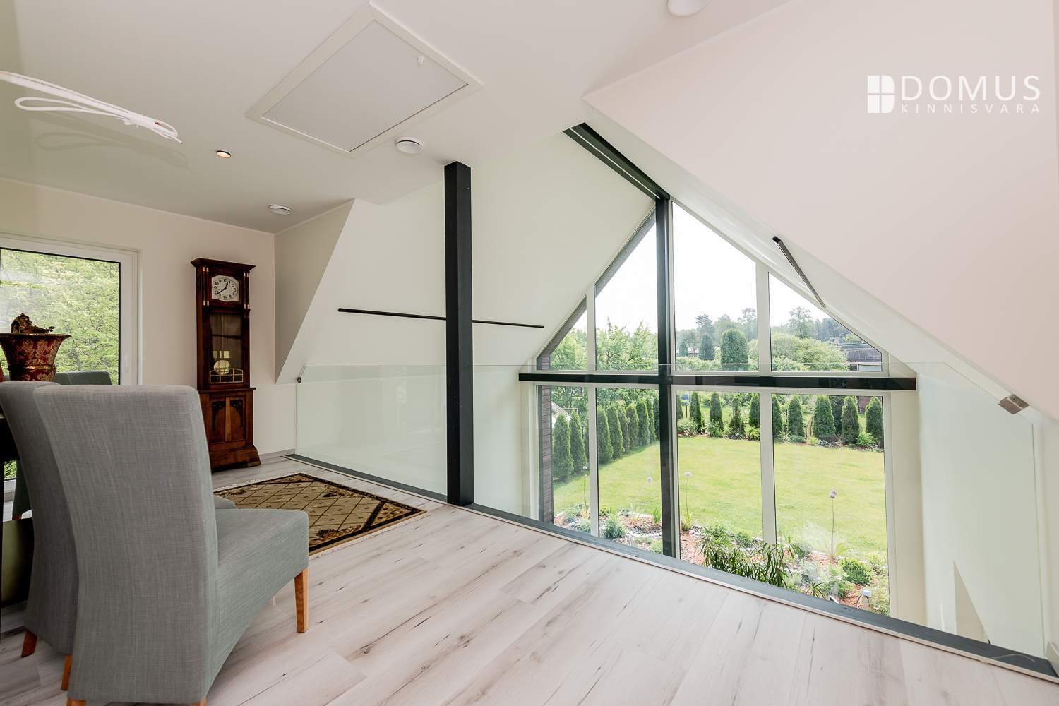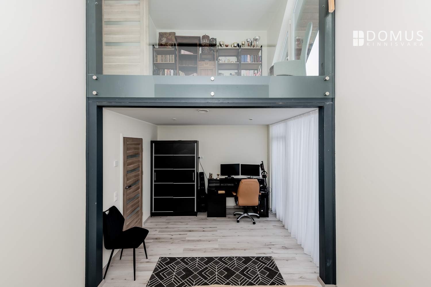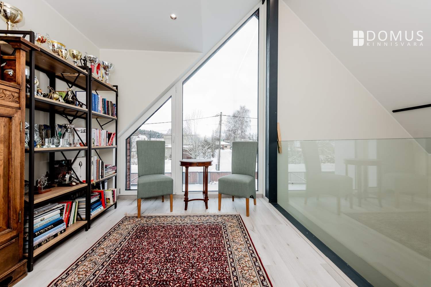 A landing with an interior balcony overlooking the living room
