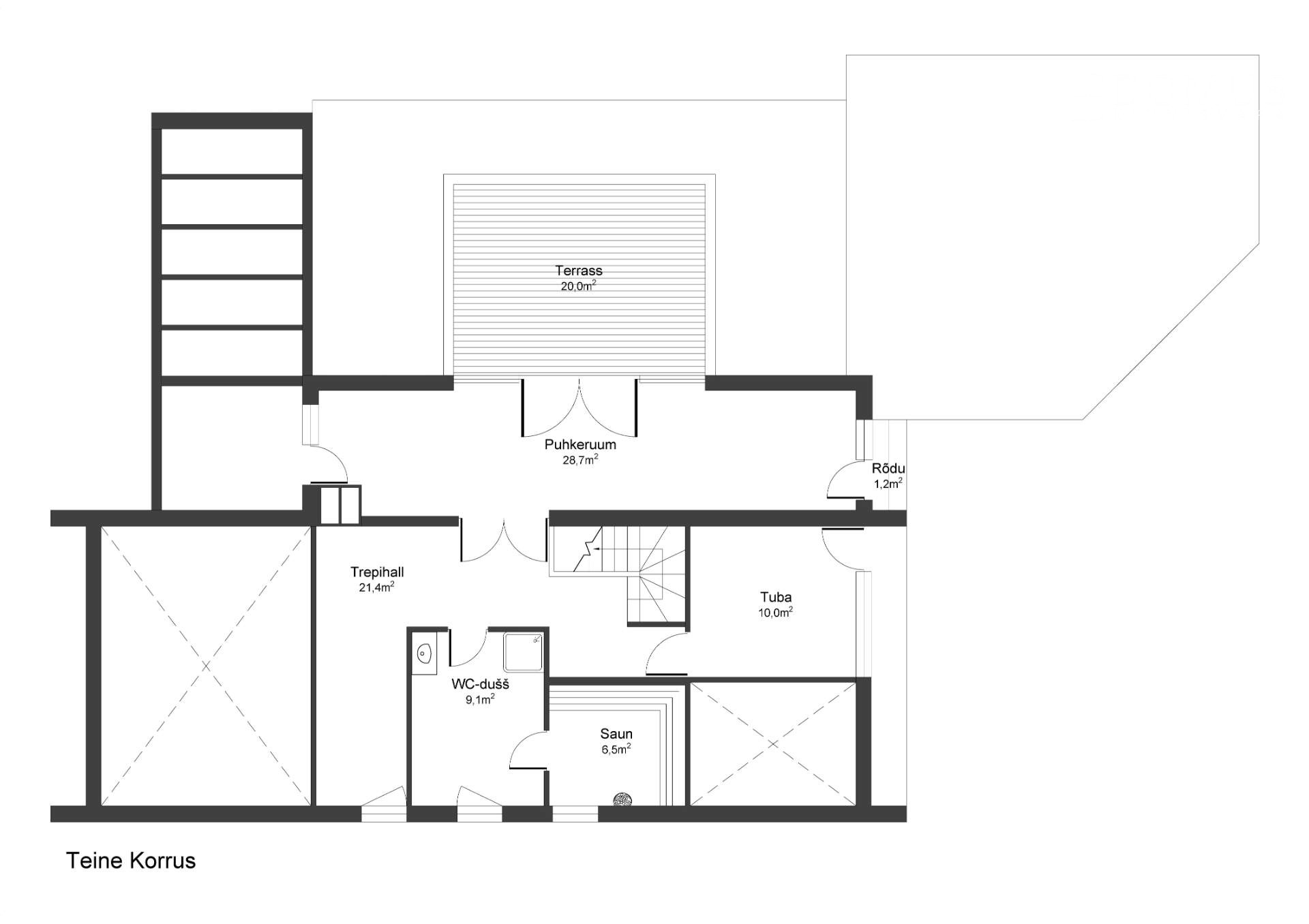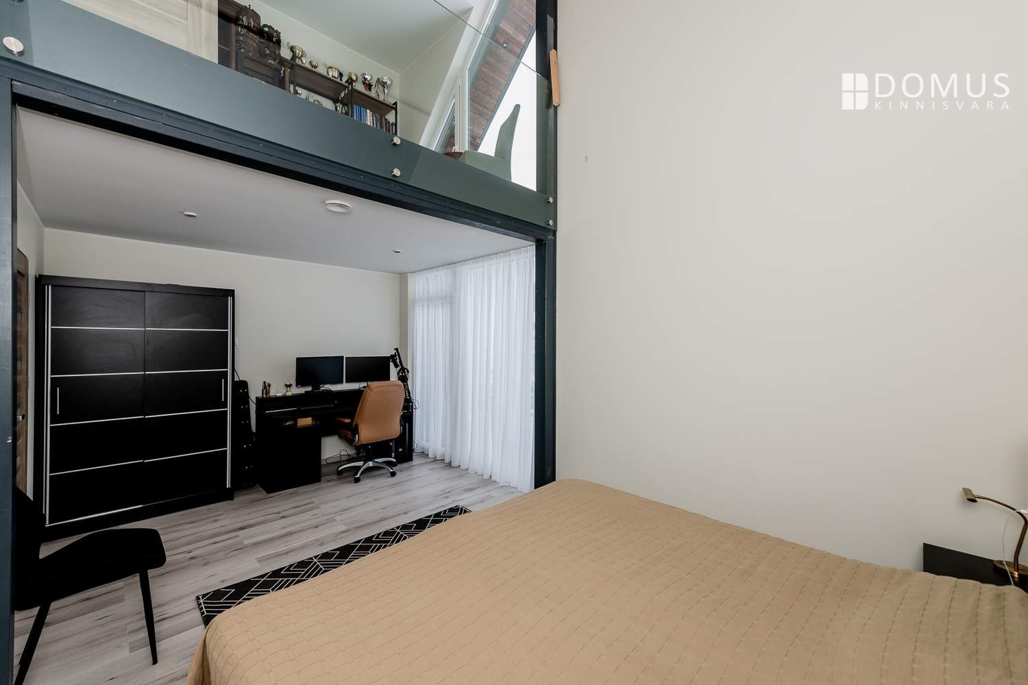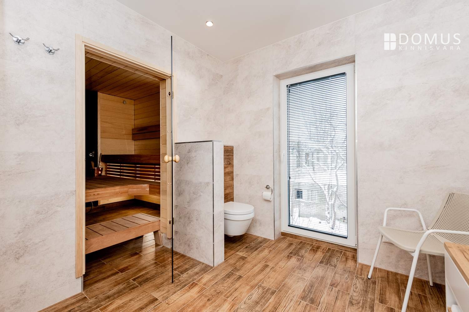 A large multifunctional room currently used as a guest room and sauna lounge; it can also be converted into a bedroom or even two separate rooms
