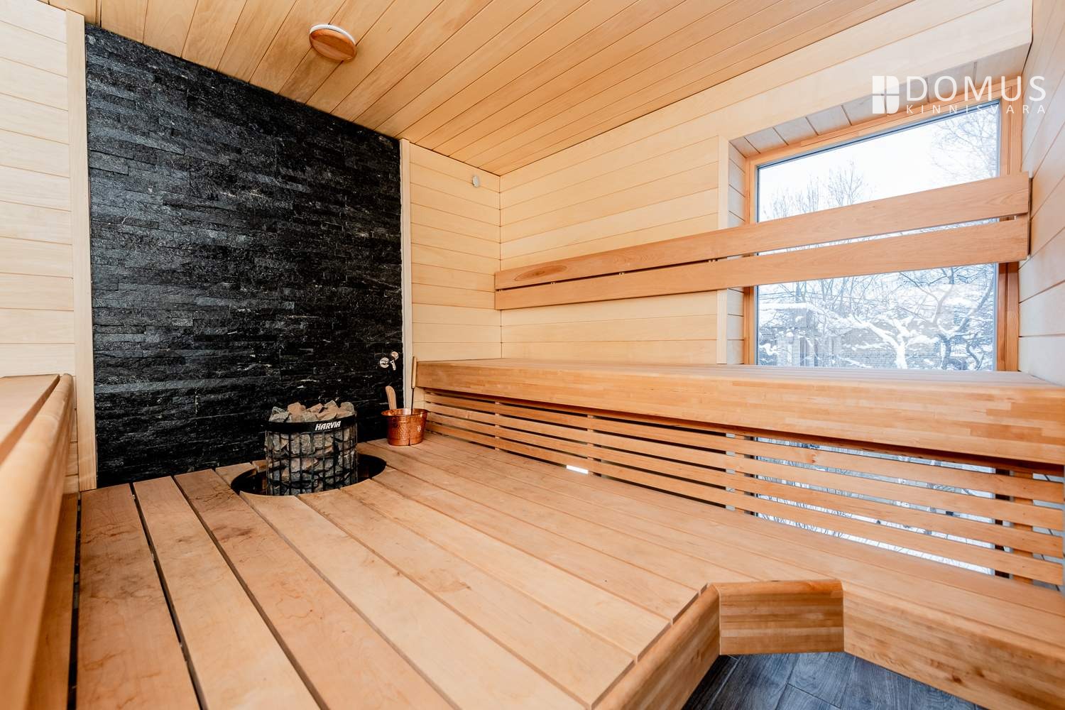 A sauna with spacious benches and an electric heater