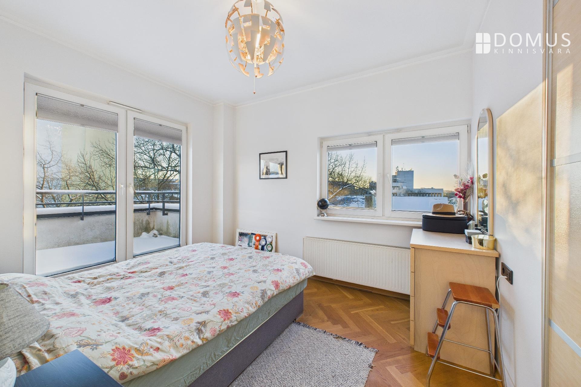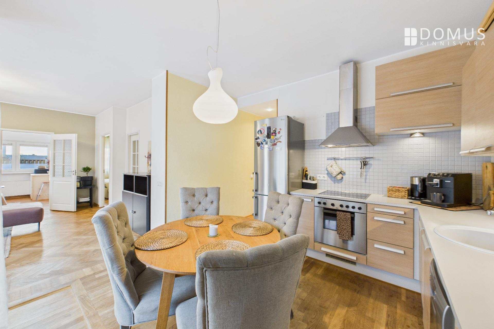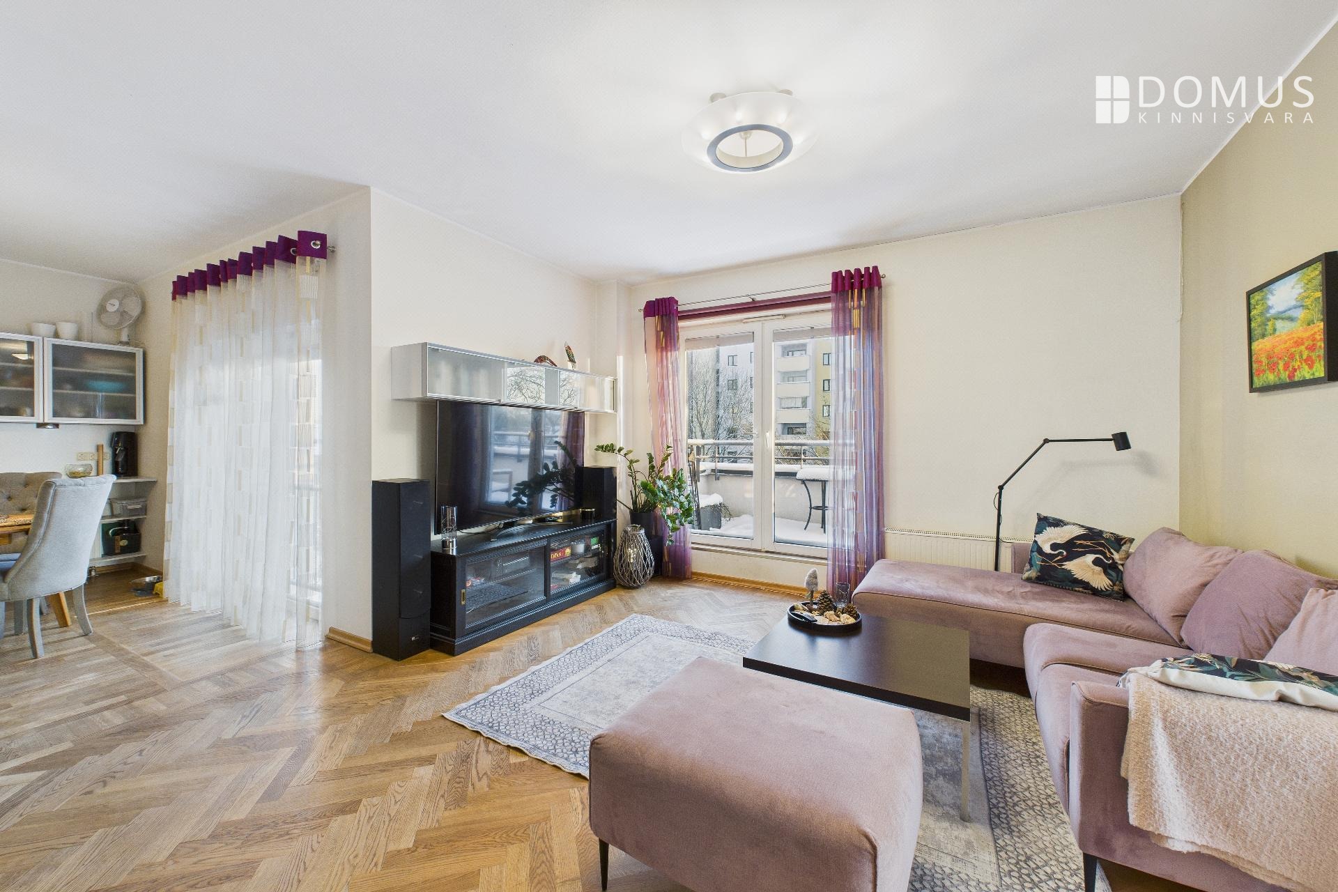 The apartment consists of a living room, kitchen, balcony, two bedrooms, hallway, storage room, and bathroom. From the living room and one bedroom there is access to a spacious 16.7 m² terrace, offering a beautiful view, including the iconic Pikk Hermann Tower. Built-in wardrobes are installed in the bedrooms and hallway, and the kitchen is equipped with furniture and appliances.
