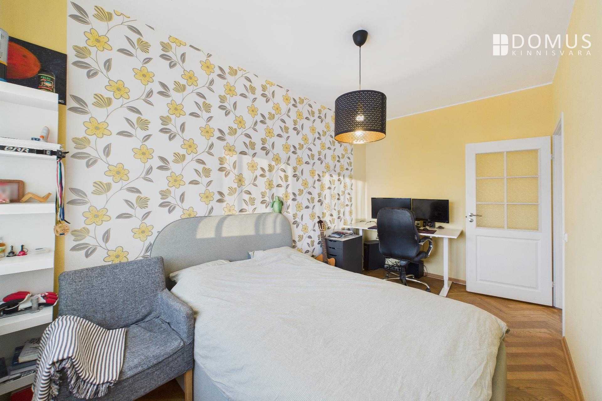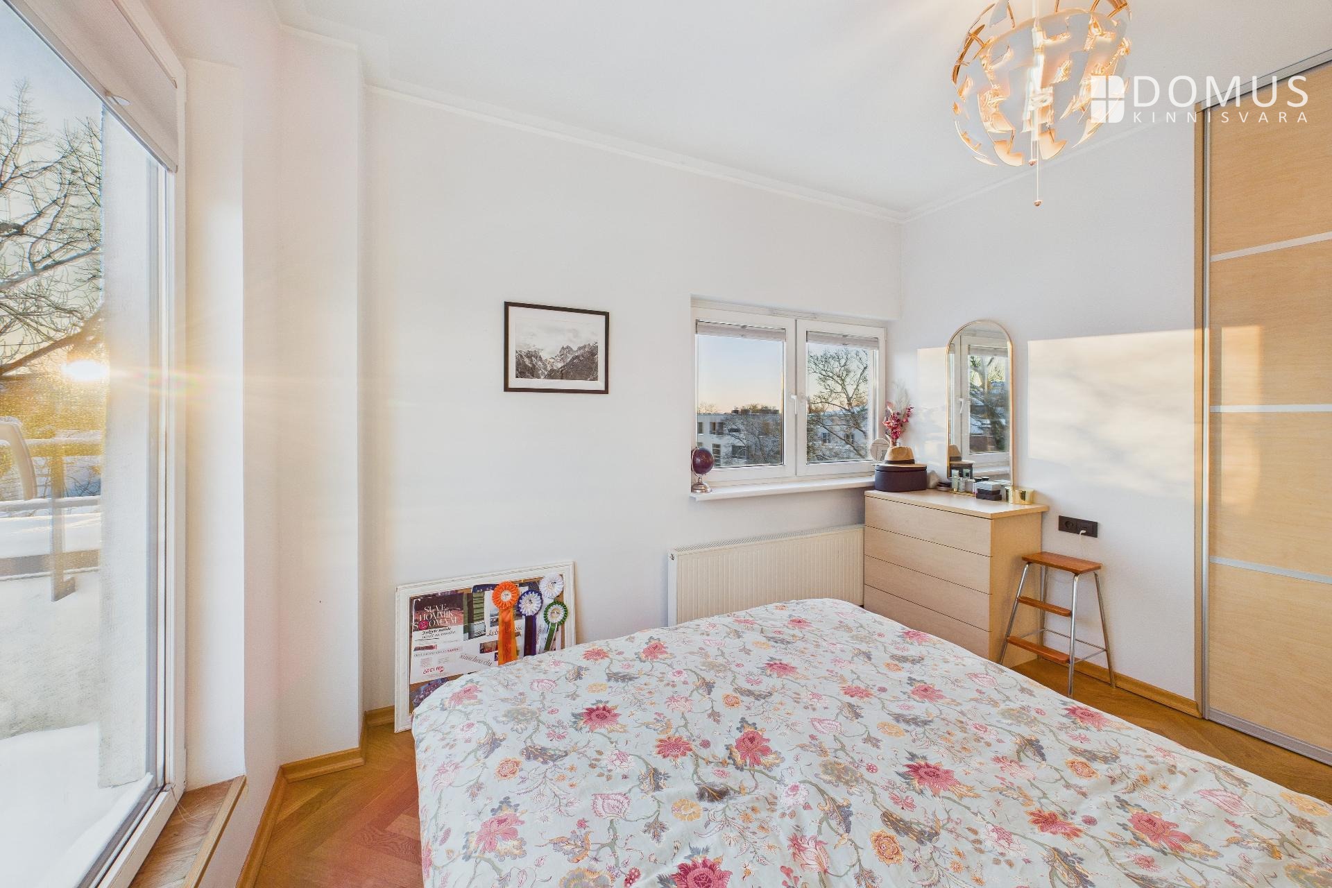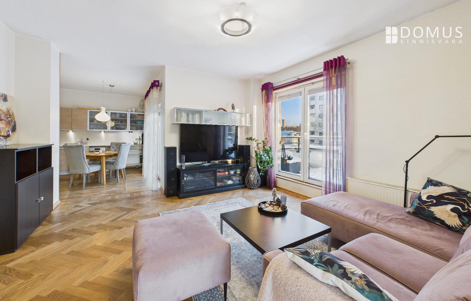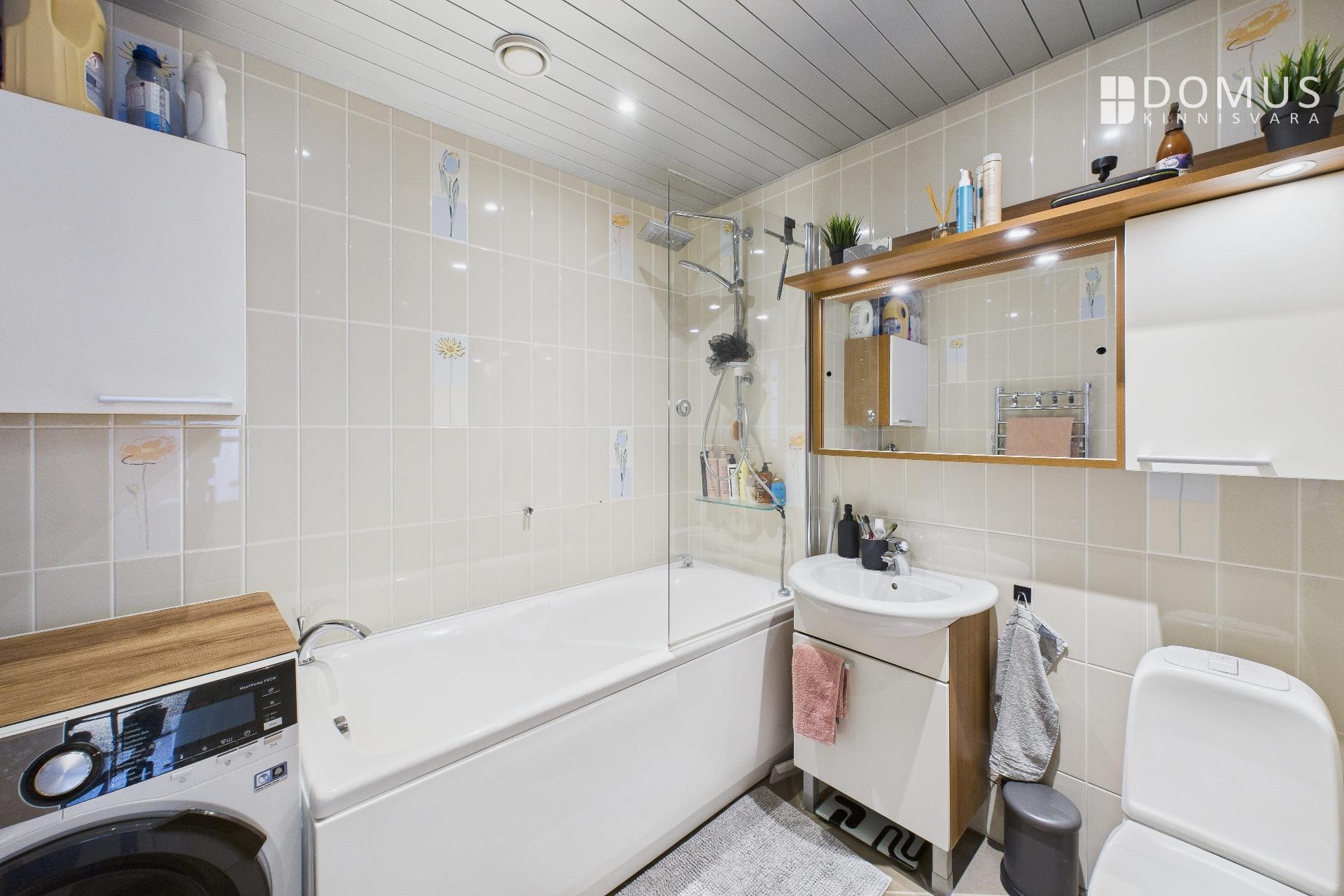 The apartment consists of a living room, kitchen, balcony, two bedrooms, hallway, storage room, and bathroom. From the living room and one bedroom there is access to a spacious 16.7 m² terrace, offering a beautiful view, including the iconic Pikk Hermann Tower. Built-in wardrobes are installed in the bedrooms and hallway, and the kitchen is equipped with furniture and appliances.