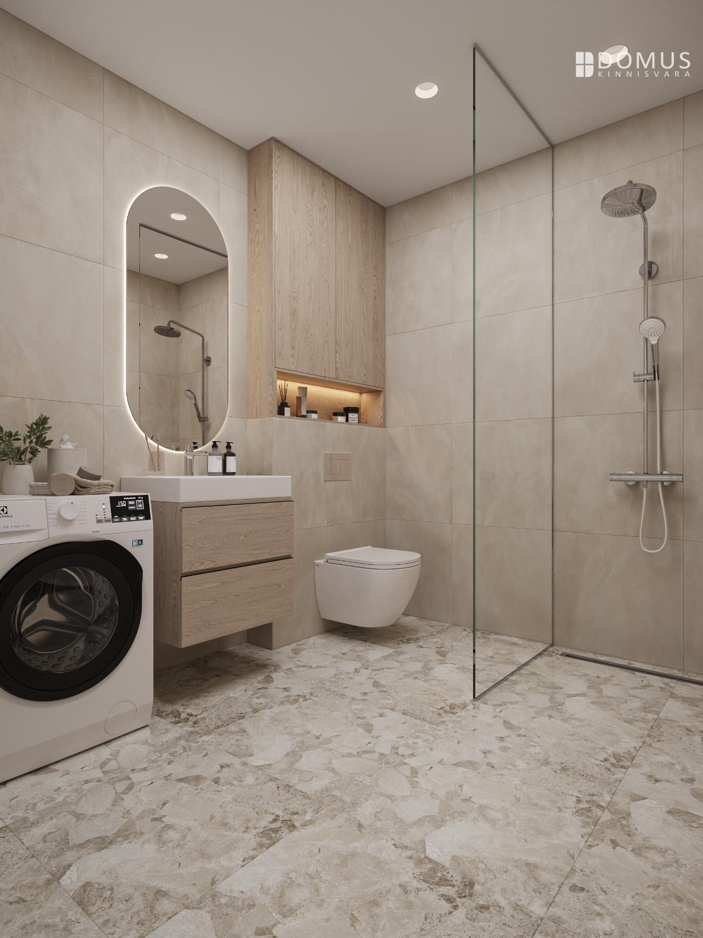 Two separate toilets, one of which is combined with a laundry room, add to everyday comfort.