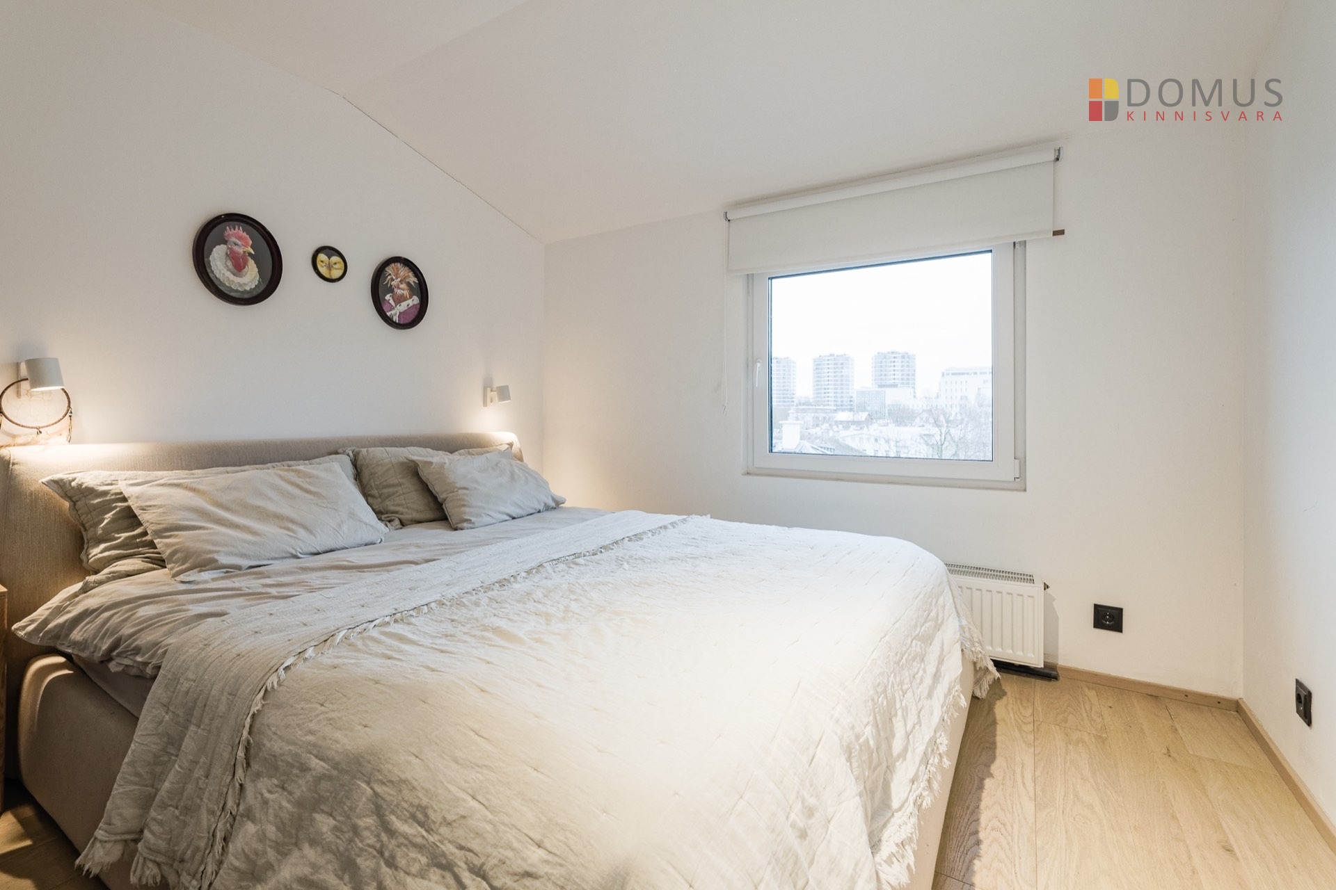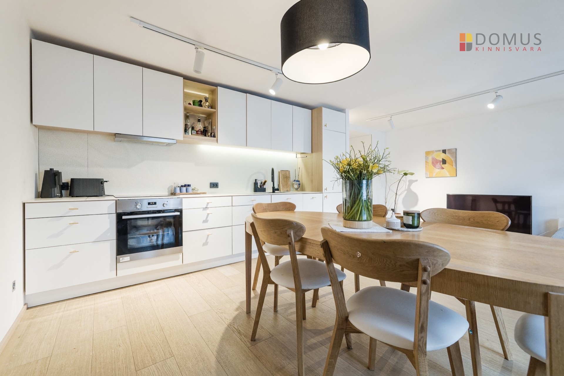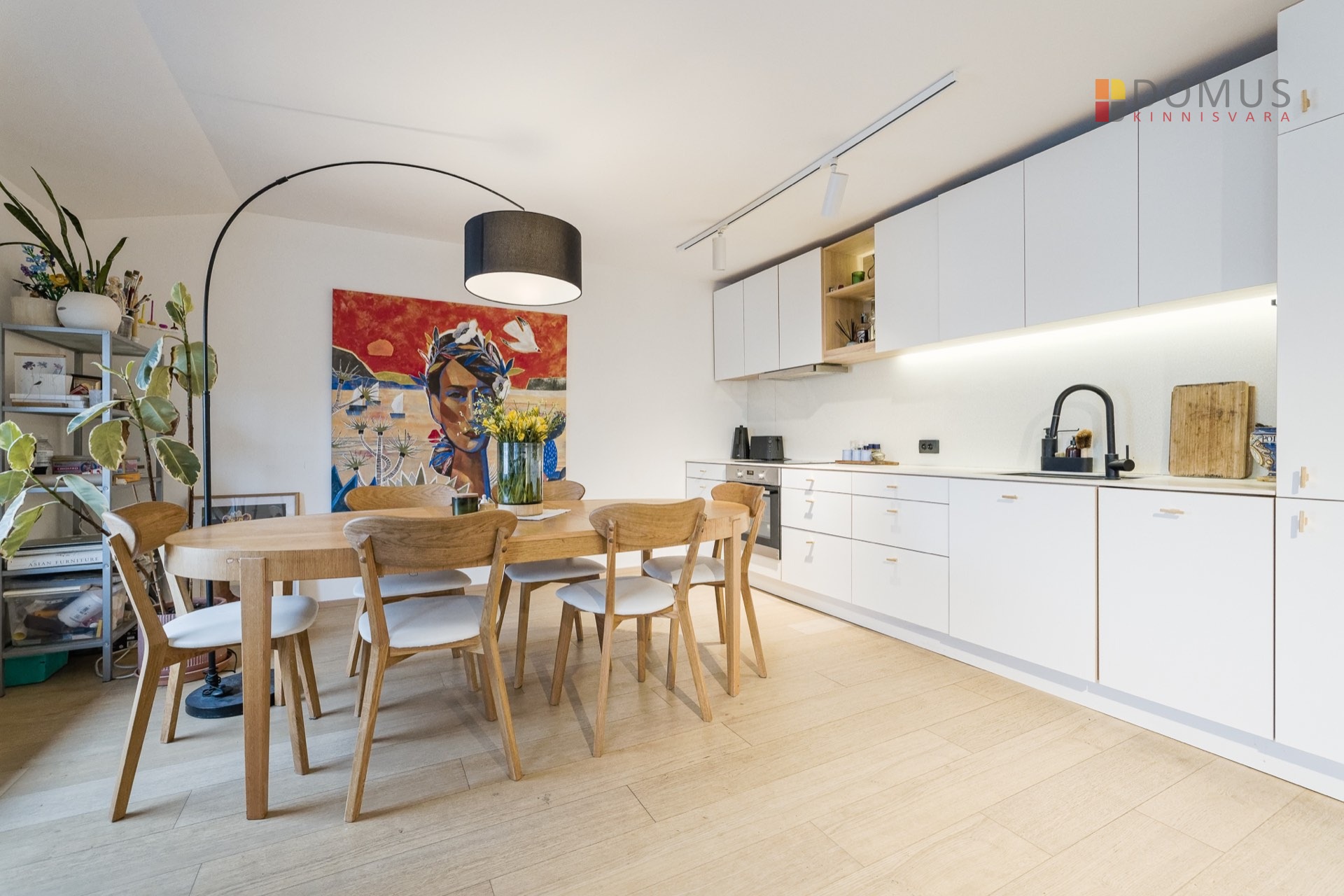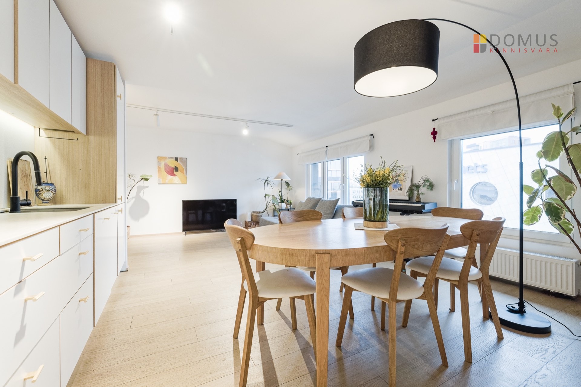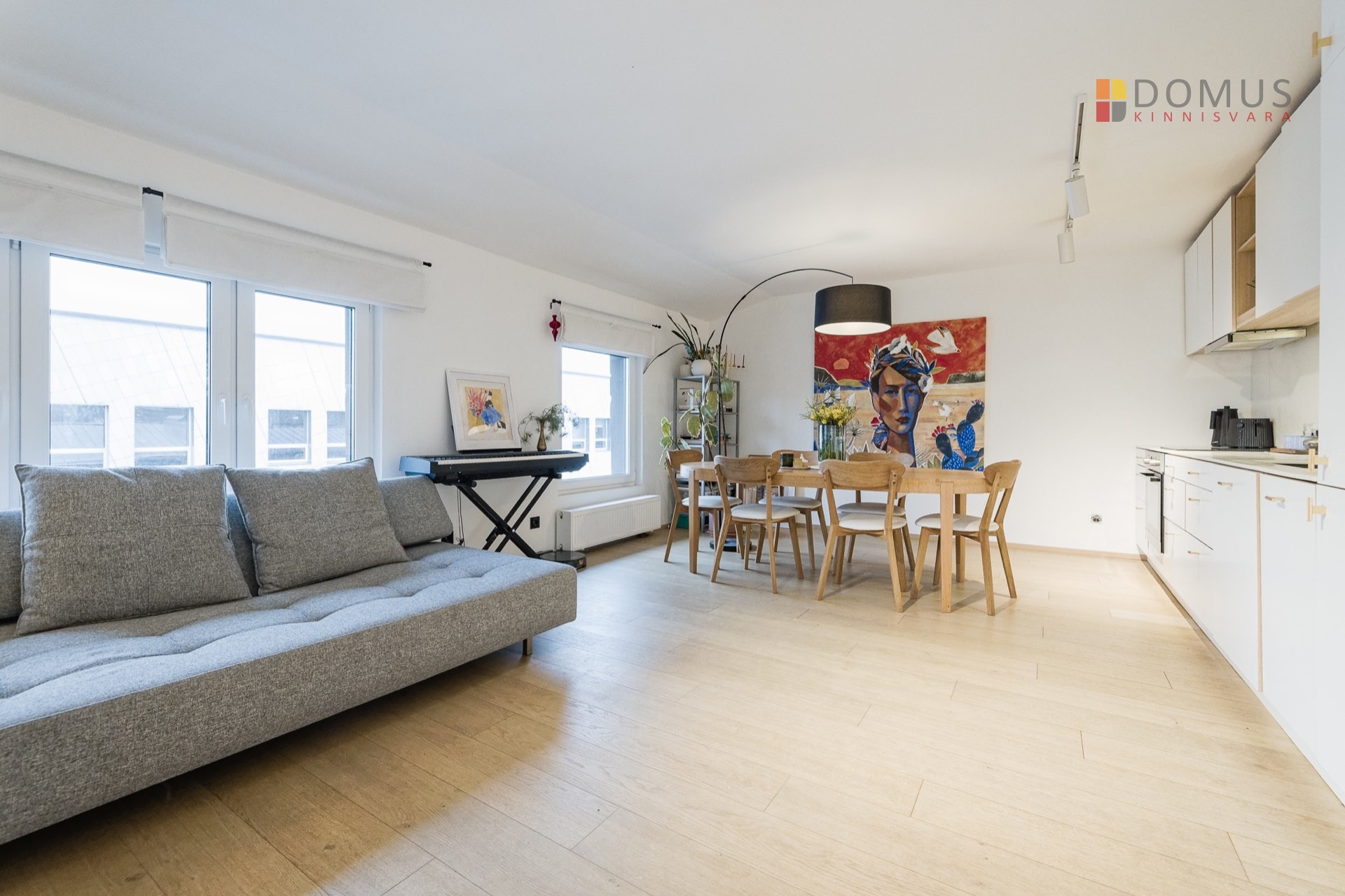 The total area of the apartment is 76.7 m². Spacious living room with an open kitchen, two bedrooms, a bathroom with a toilet, sauna, and a large entrance area with built-in technical equipment. Warm floors in the bathroom and hallway. The apartment is very bright, warm, and quiet. The bedroom windows face the inner courtyard on the morning side, catching the sun. There are no neighbors above, so quietness is guaranteed. Thanks to its unique location, the apartment enjoys sunlight throughout the day.