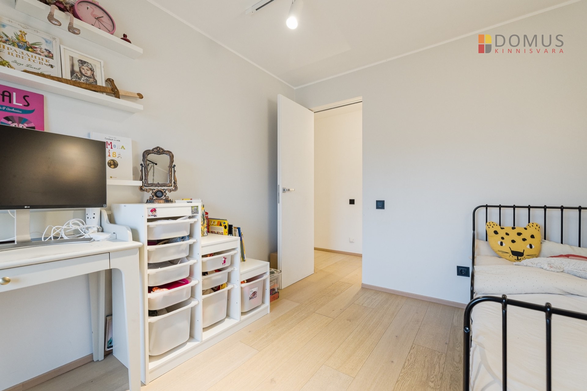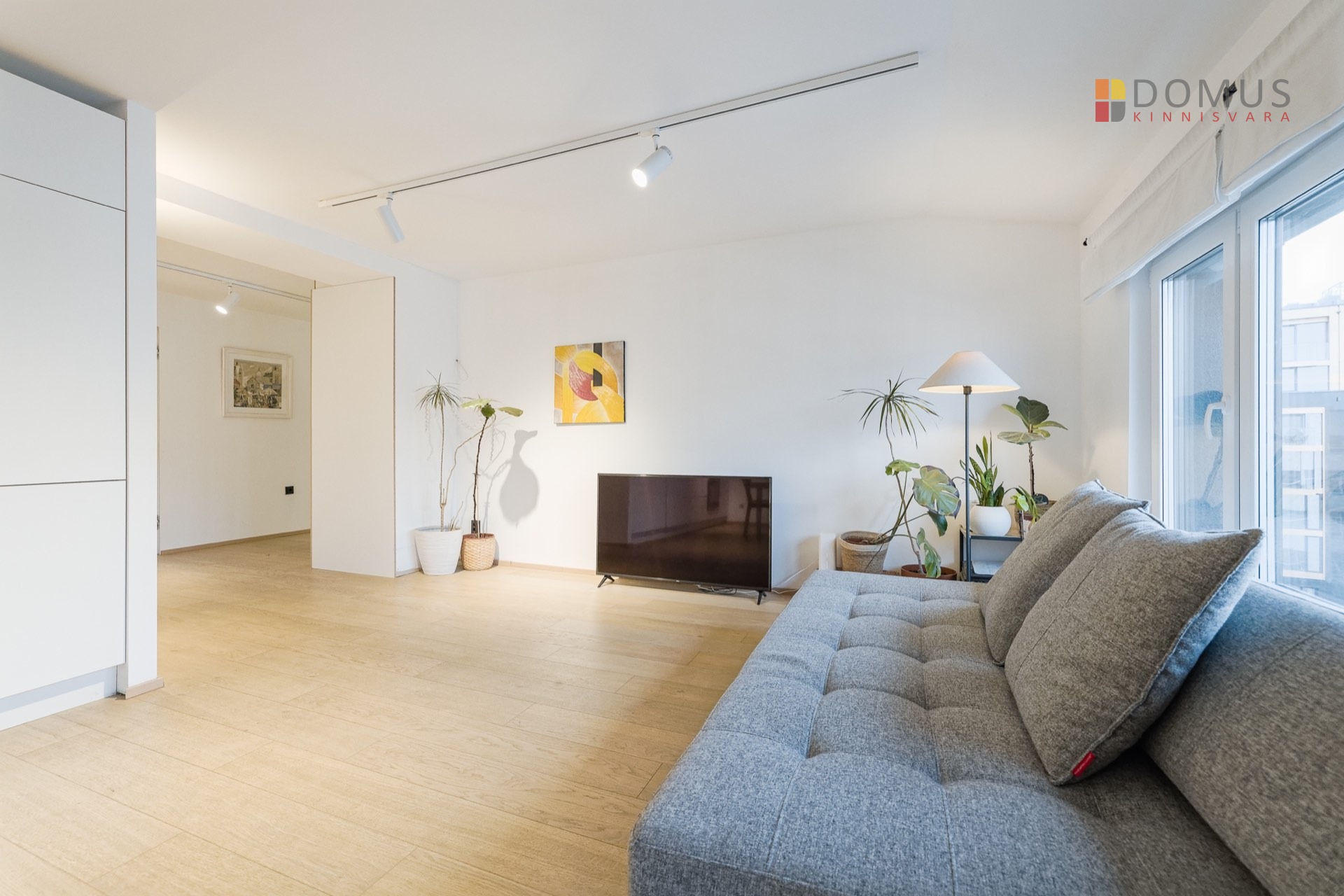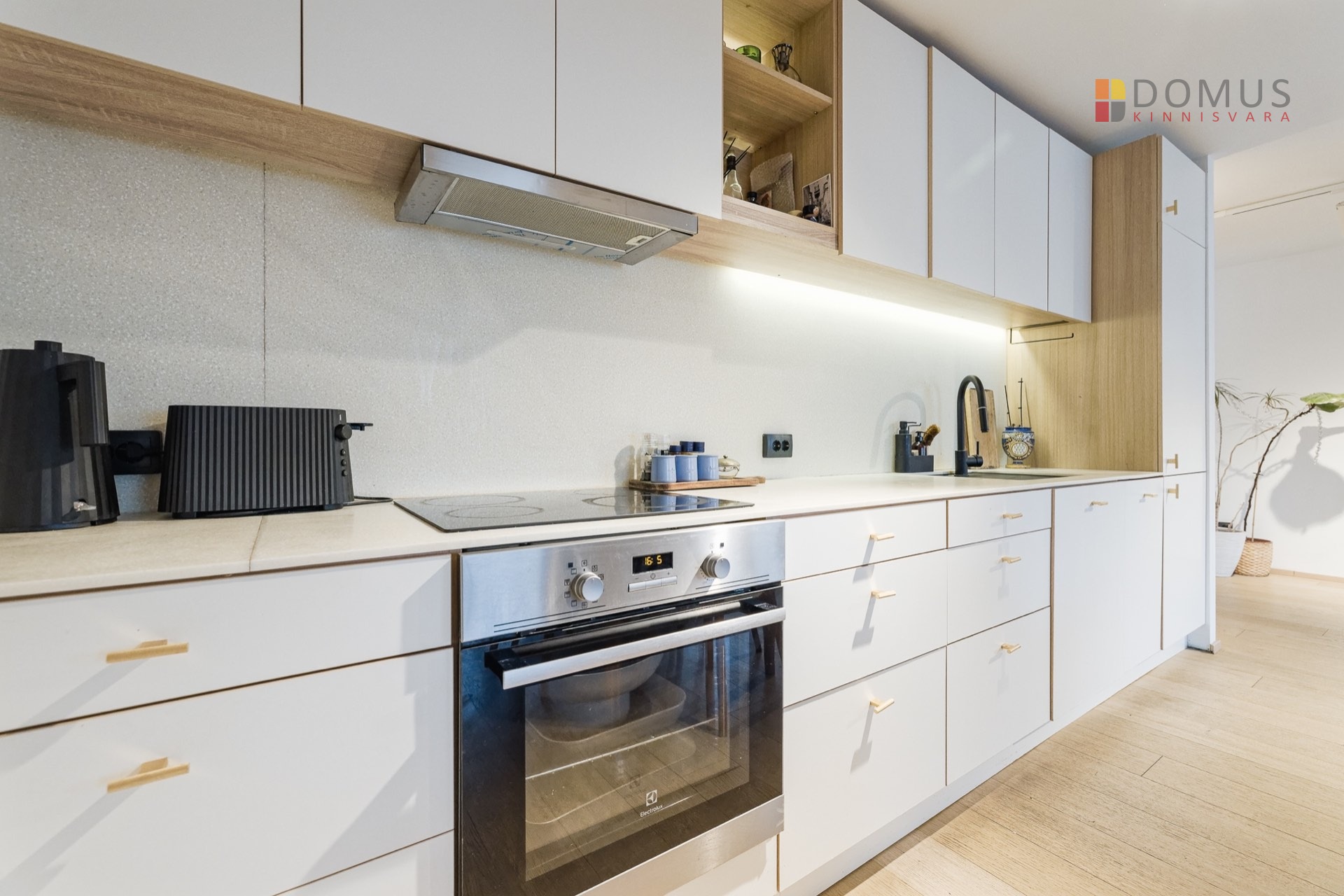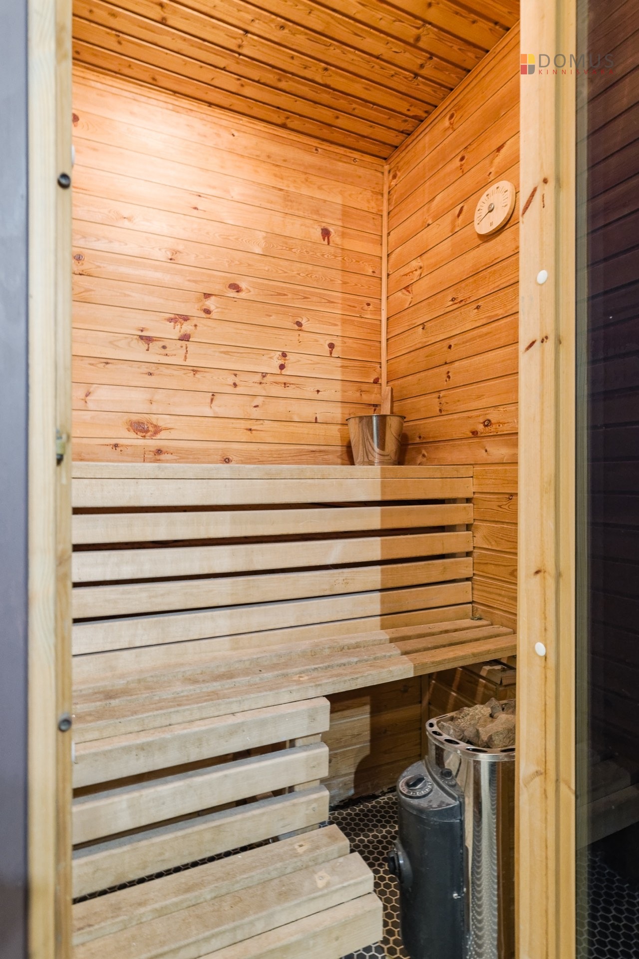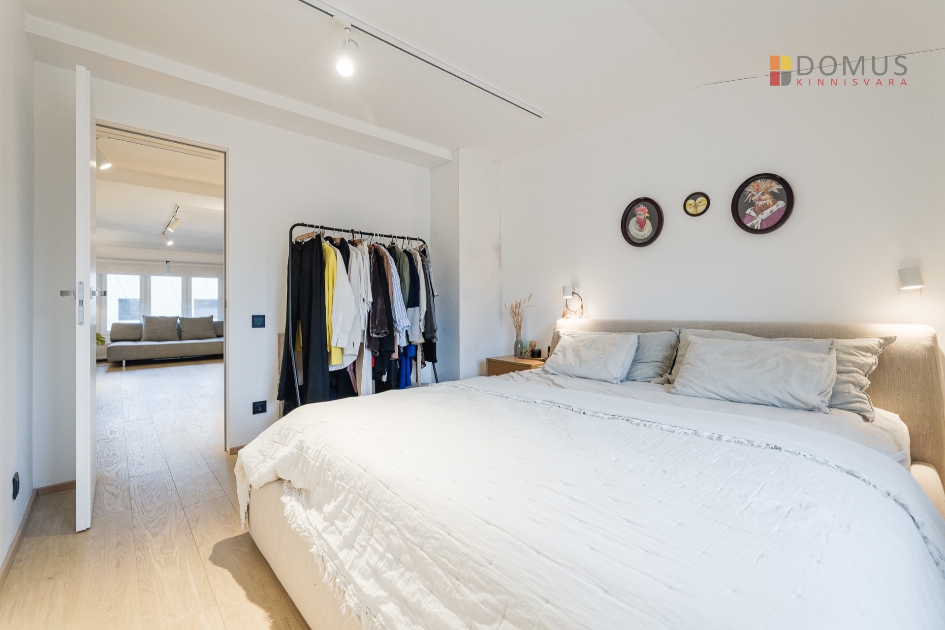 The total area of the apartment is 76.7 m². Spacious living room with an open kitchen, two bedrooms, a bathroom with a toilet, sauna, and a large entrance area with built-in technical equipment. Warm floors in the bathroom and hallway. The apartment is very bright, warm, and quiet. The bedroom windows face the inner courtyard on the morning side, catching the sun. There are no neighbors above, so quietness is guaranteed. Thanks to its unique location, the apartment enjoys sunlight throughout the day.