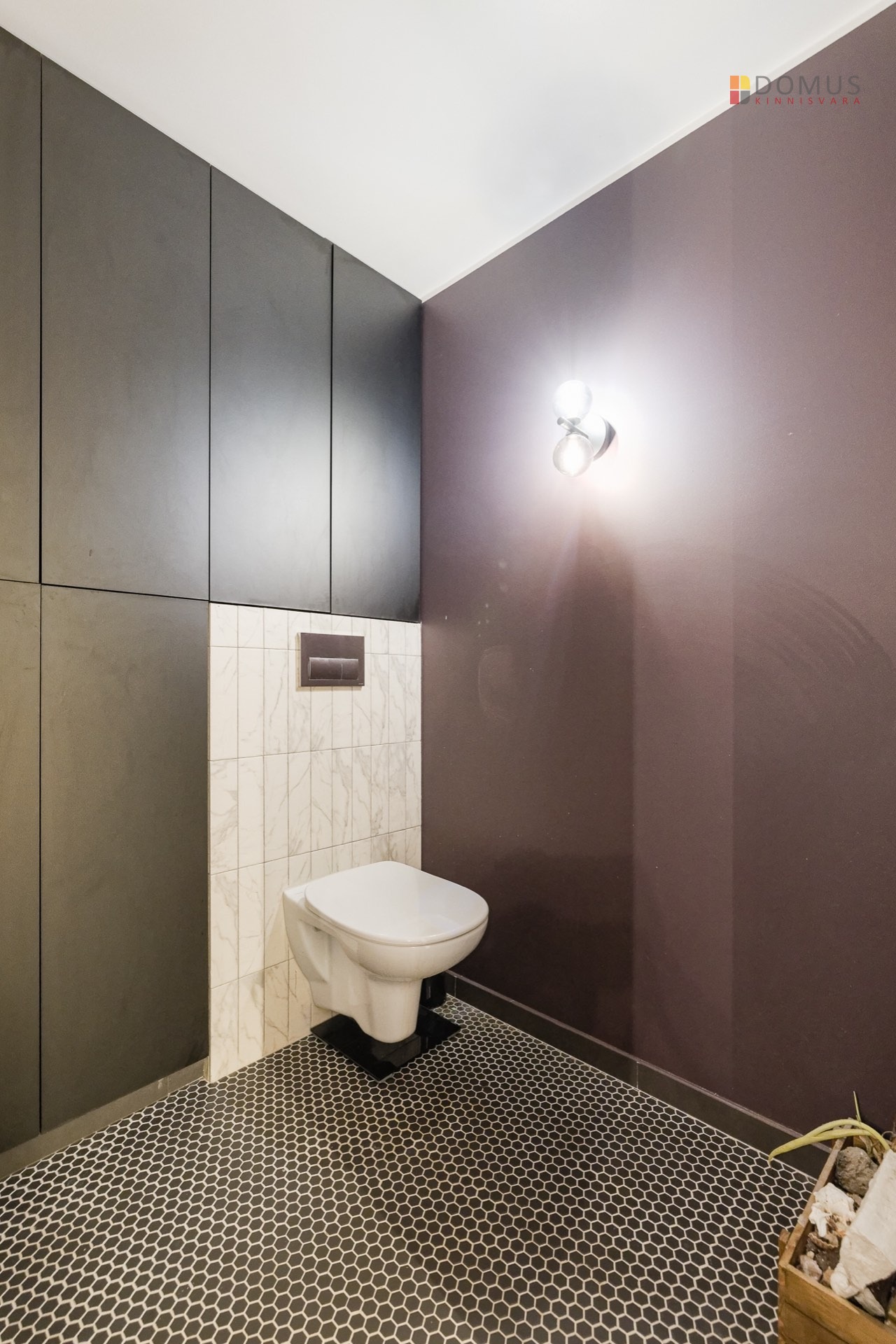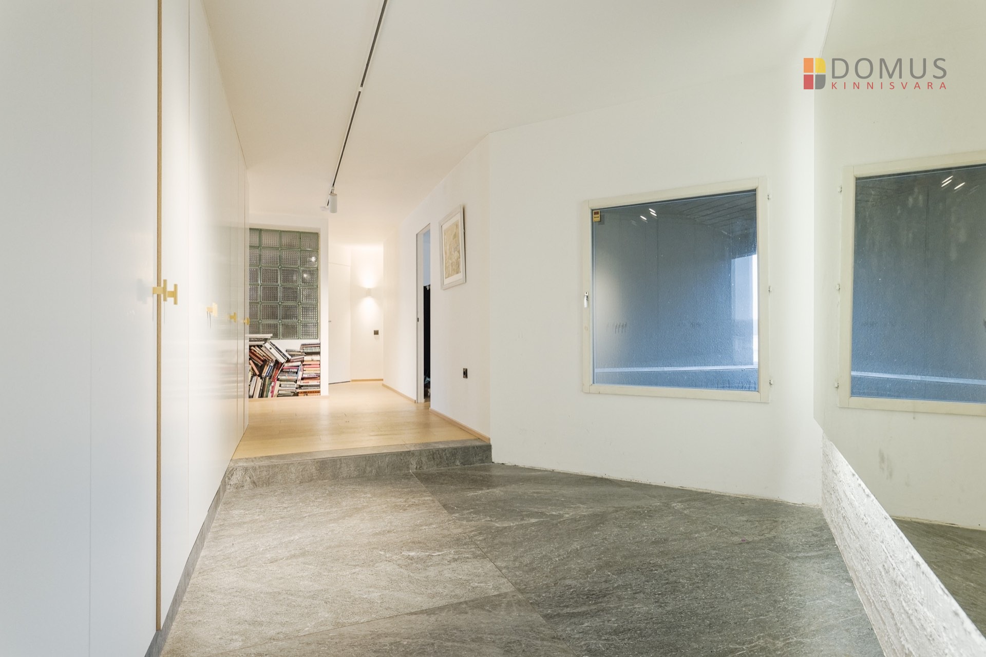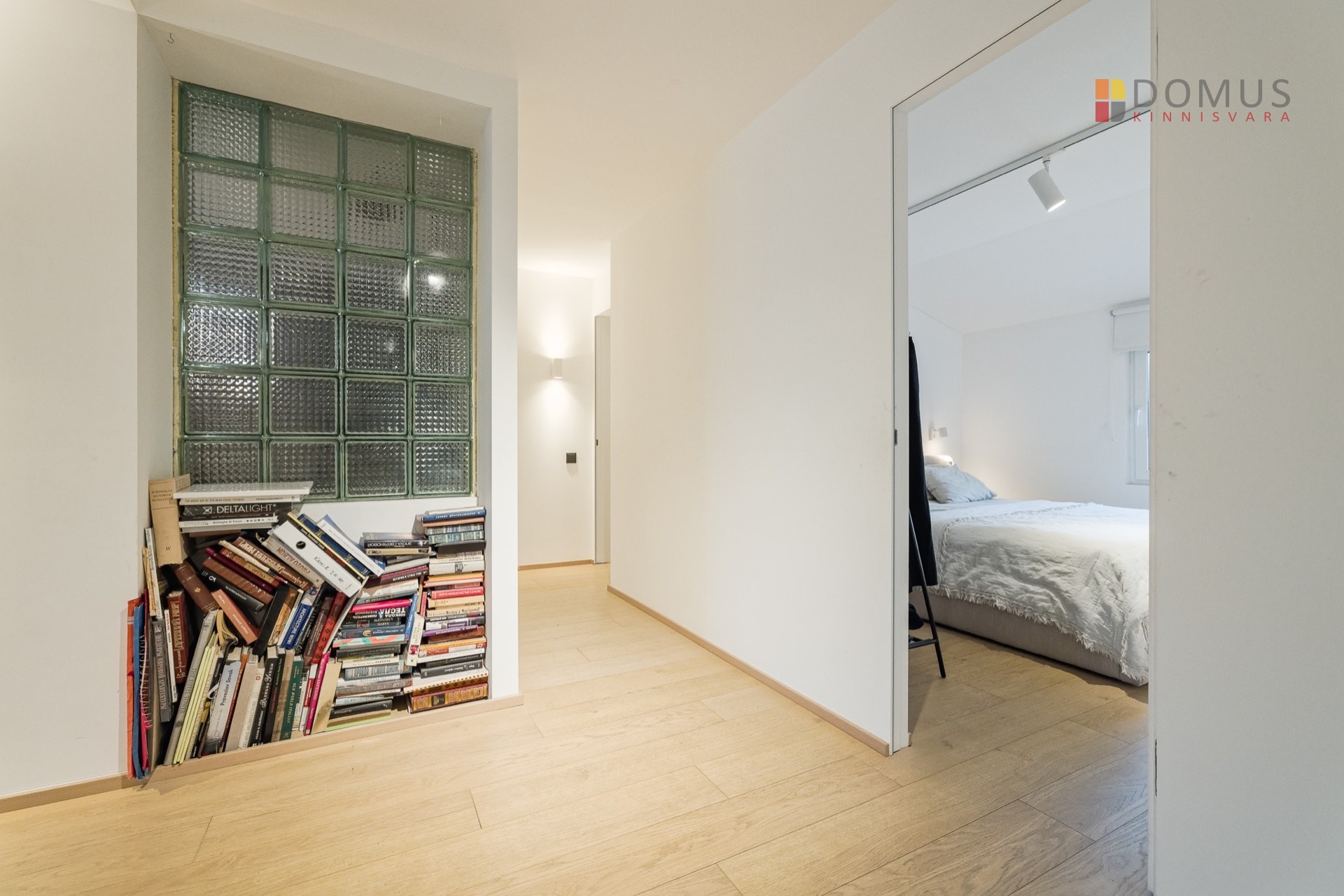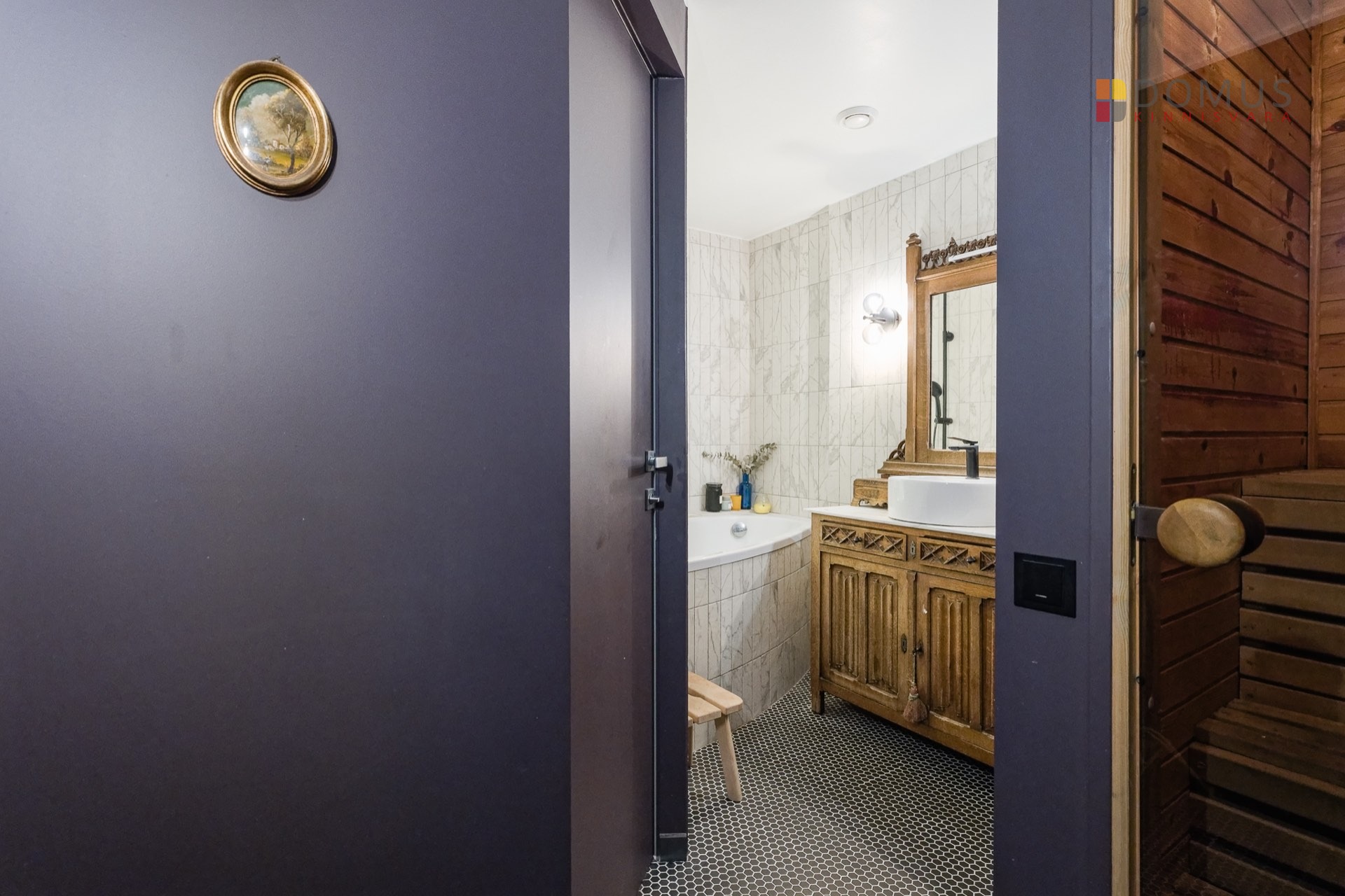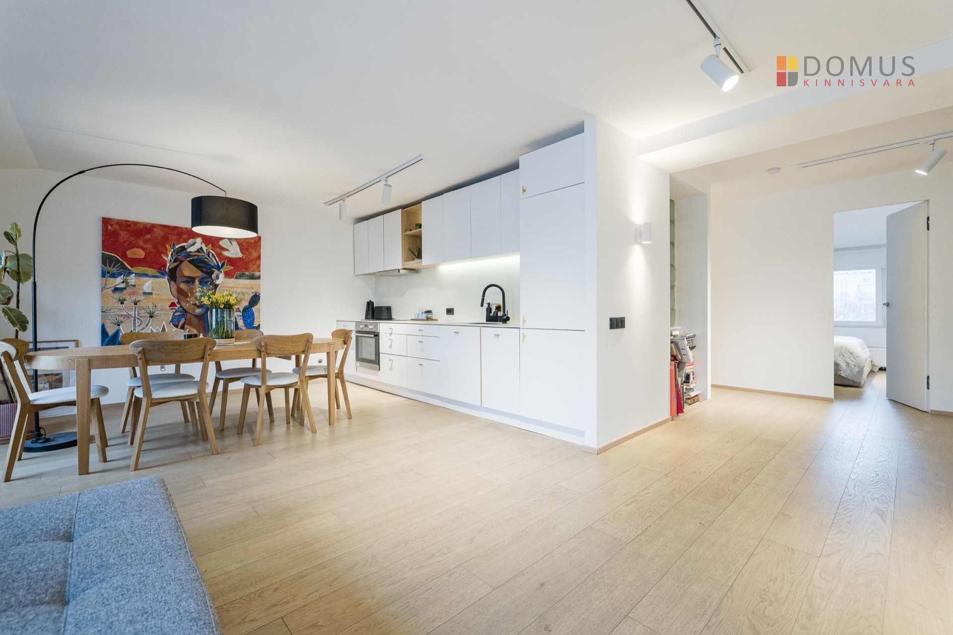 The total area of the apartment is 76.7 m². Spacious living room with an open kitchen, two bedrooms, a bathroom with a toilet, sauna, and a large entrance area with built-in technical equipment. Warm floors in the bathroom and hallway. The apartment is very bright, warm, and quiet. The bedroom windows face the inner courtyard on the morning side, catching the sun. There are no neighbors above, so quietness is guaranteed. Thanks to its unique location, the apartment enjoys sunlight throughout the day.