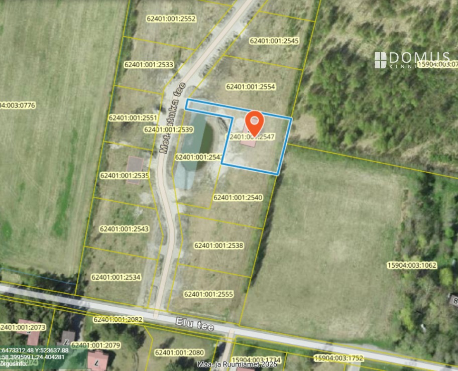 The property at Metsatuka tee 7 is located in Papsaare village, in the city of Pärnu. It lies within the detailed planning area of Elu tee 6. The plot is registered under cadastral code 62401:001:2547. The land area is 1843 m², and the designated use is 100% residential.