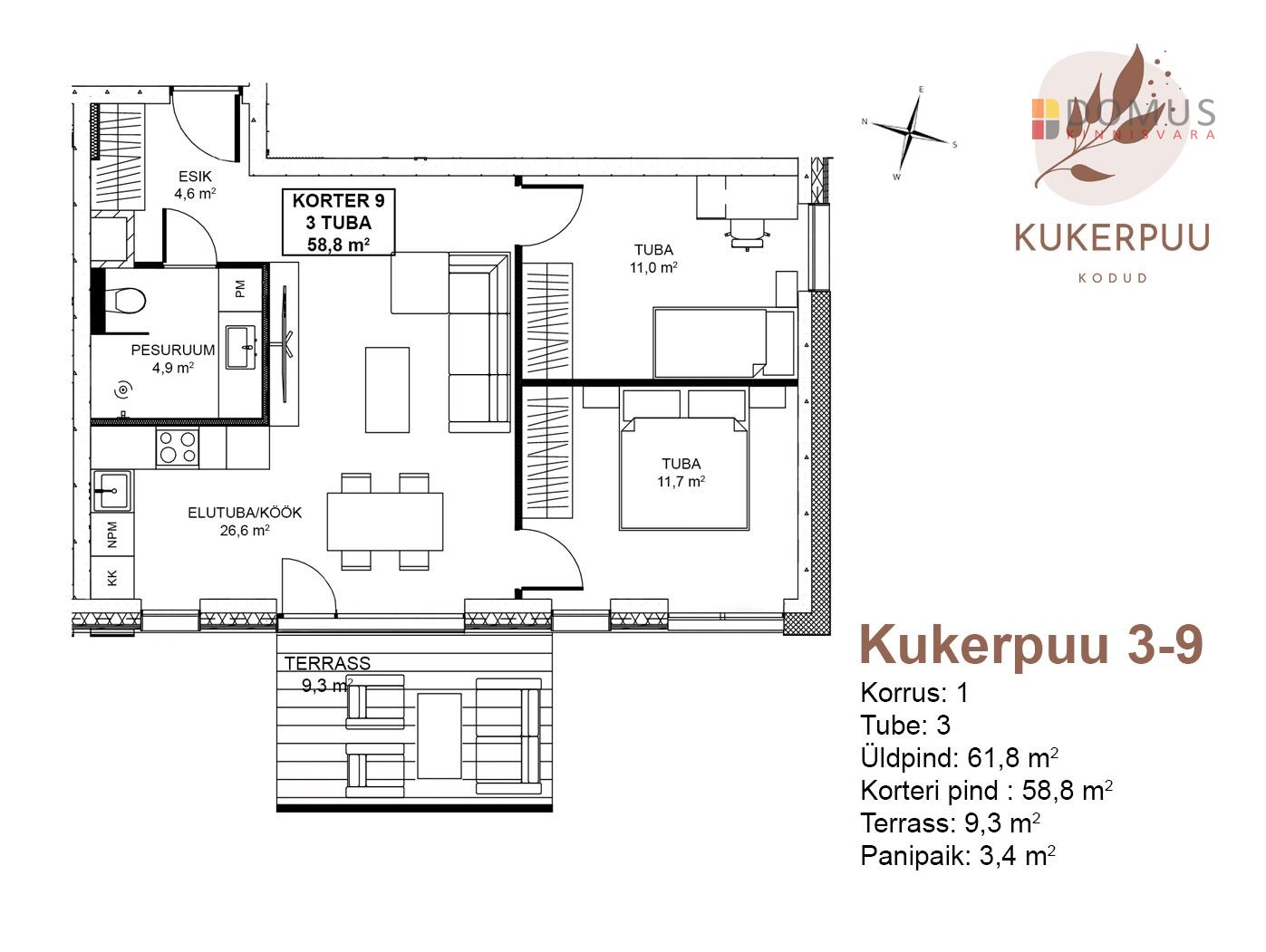 For sale apartment, 3 room - Kukerpuu tn 3-9, Raadi alev, Tartu vald, Tartu maakond