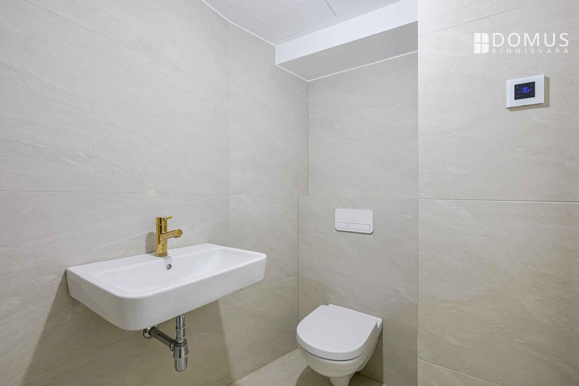 The unit has triple‑glazed wooden windows, a Villeroy & Boch O.Novo wall‑hung toilet and sink, and a Danish Adora Infigo shower system and mixer.