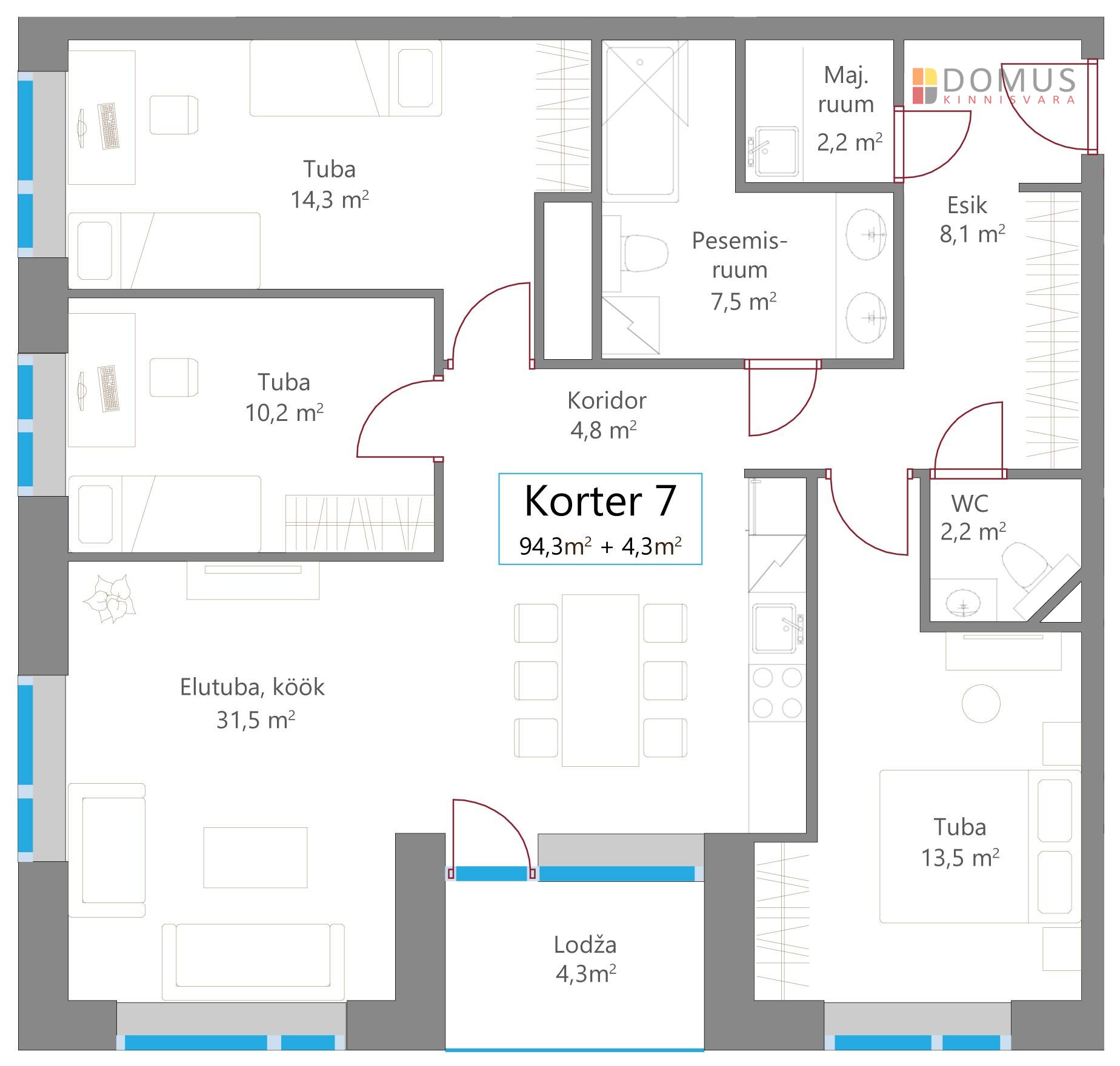 The total area of the apartment is 94.3 m² plus a 4.3 m² glazed balcony. The layout is open and well planned: a living room with a kitchen, three separate bedrooms, a bathroom with a bathtub, a separate WC, a 2.2 m² utility room, and a hallway.
