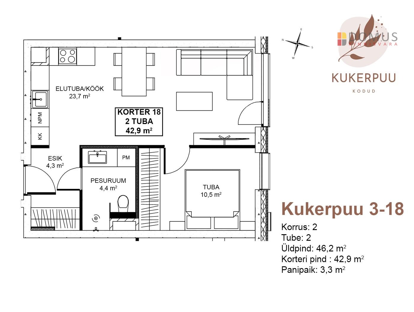 For sale apartment, 2 room - Kukerpuu tn 3-18, Raadi alev, Tartu vald, Tartu maakond