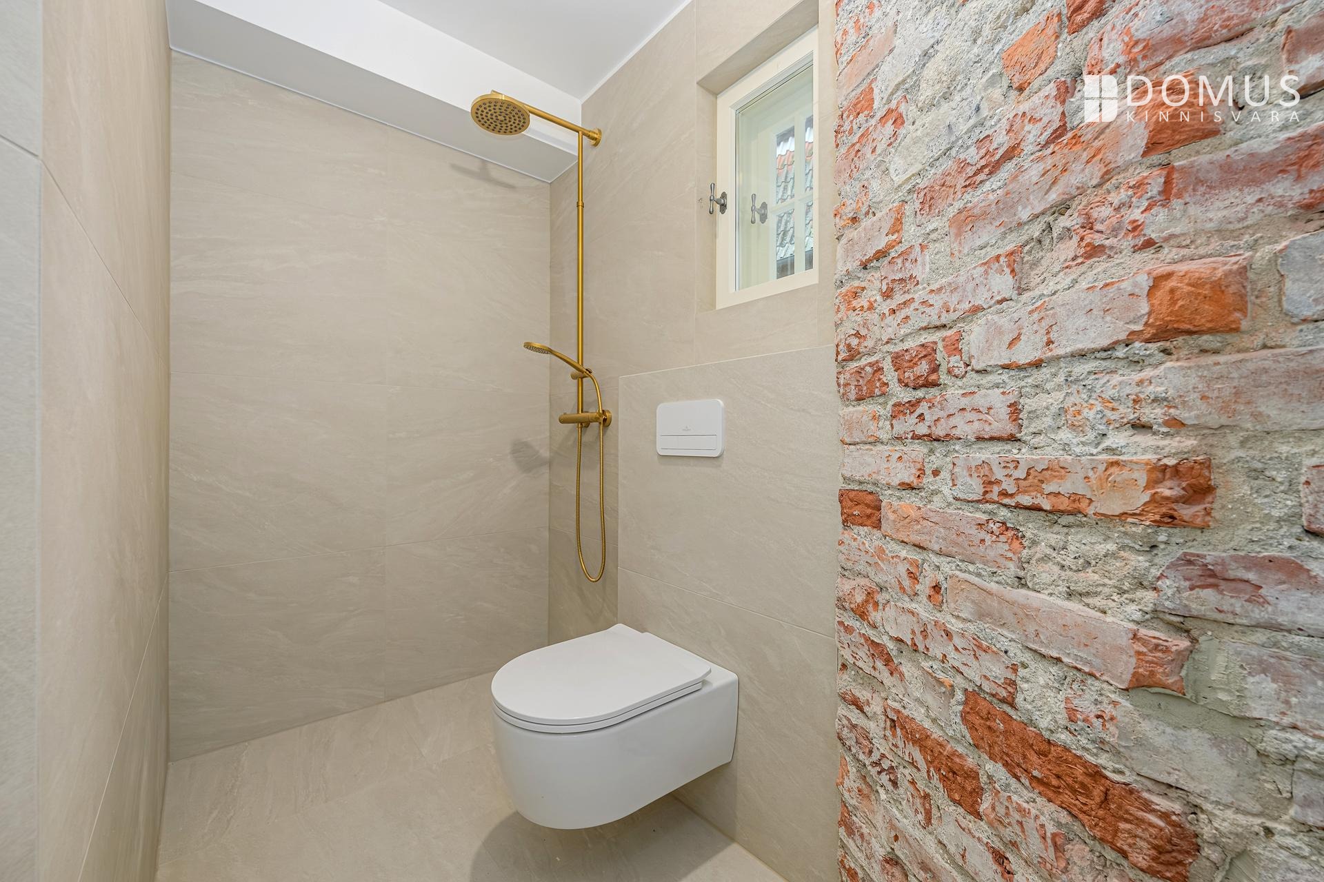 The apartment features water‑based underfloor heating connected to district heating, apartment‑specific ventilation with heat recovery, digital temperature sensors for heating and ventilation control, triple‑glazed wooden windows, and a Villeroy & Boch O.Novo wall‑hung toilet.