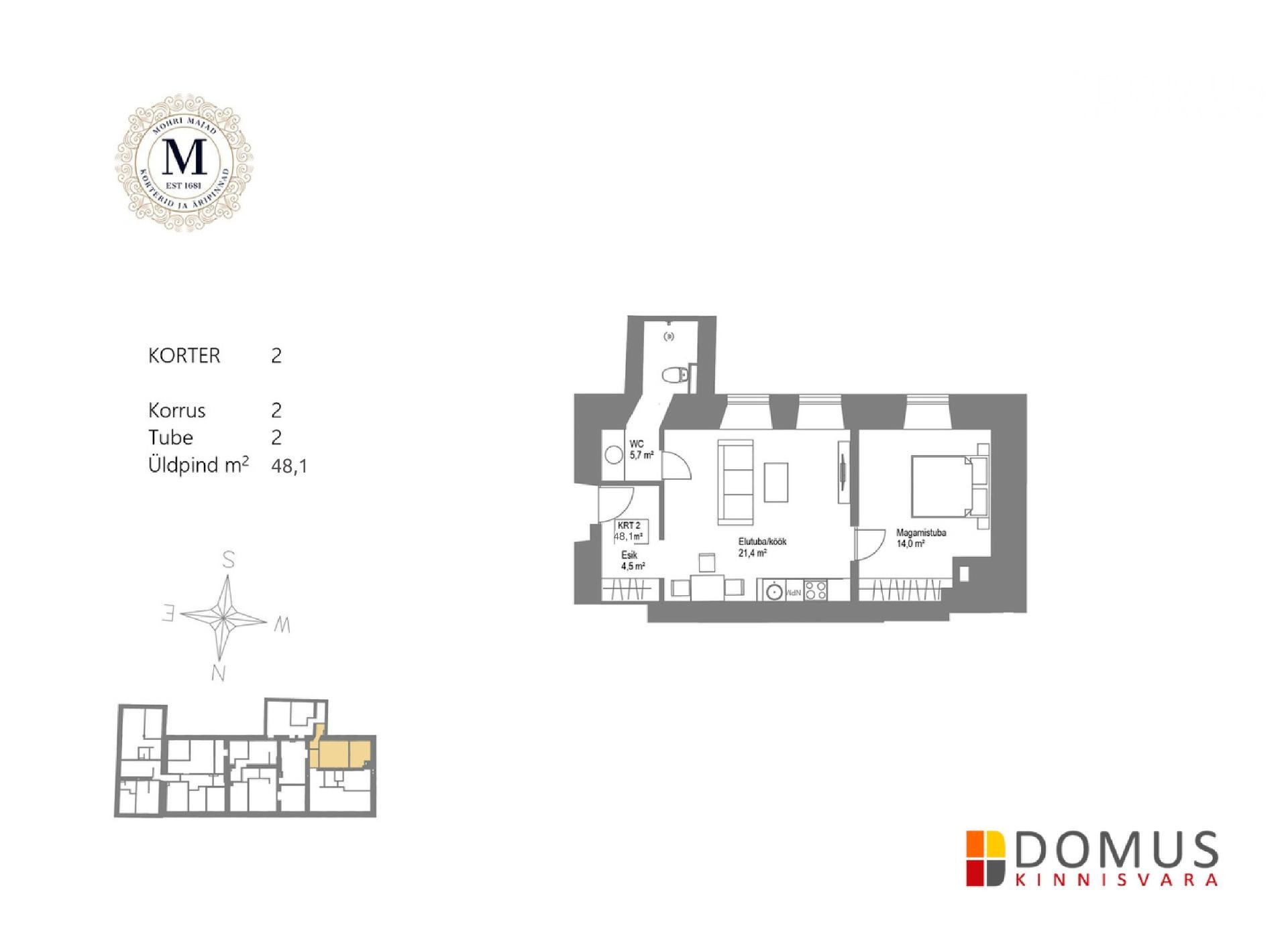 A 2‑room apartment, 48.1 m², located on the 2nd floor with a south‑facing view.