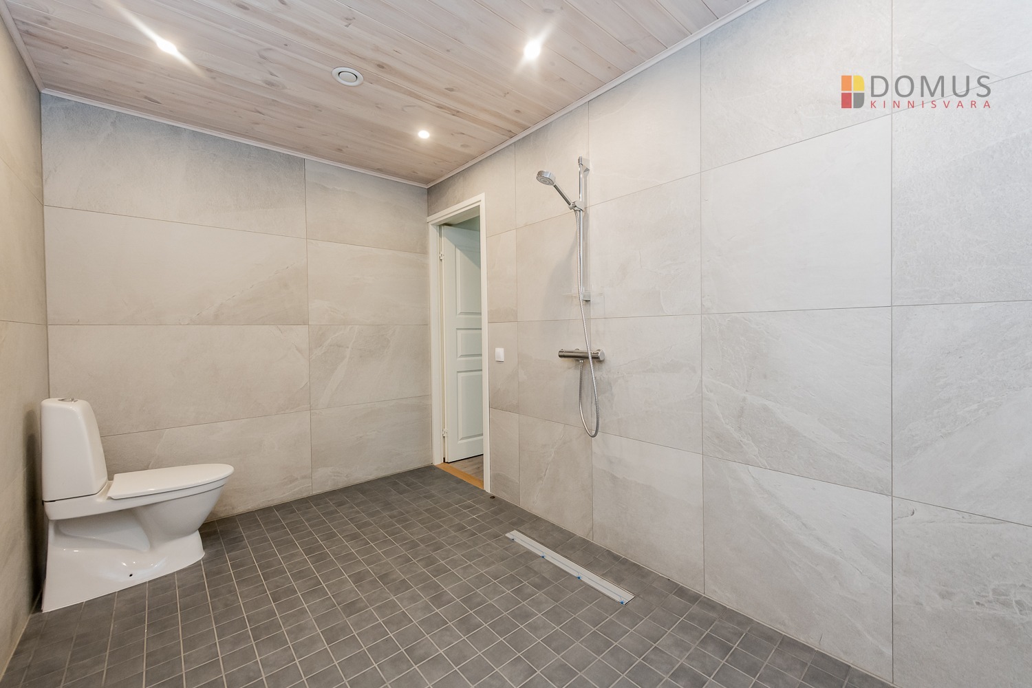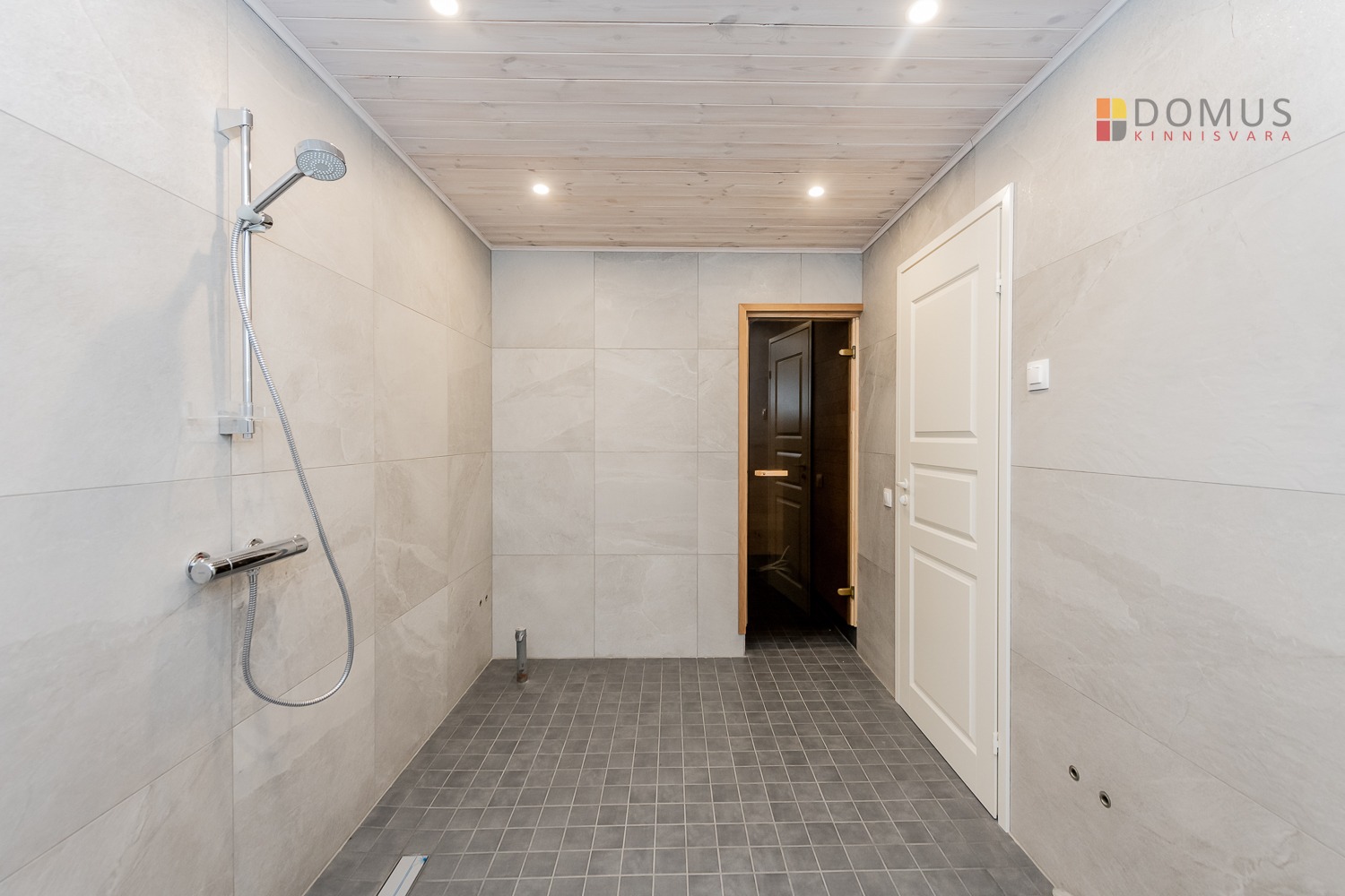 Heating is provided by a ground source heat pump with underfloor heating on the ground floor and radiators upstairs. Additionally, there's electric underfloor heating in the bathroom for summer comfort. Heat recovery ventilation ensures a healthy indoor climate year-round.
