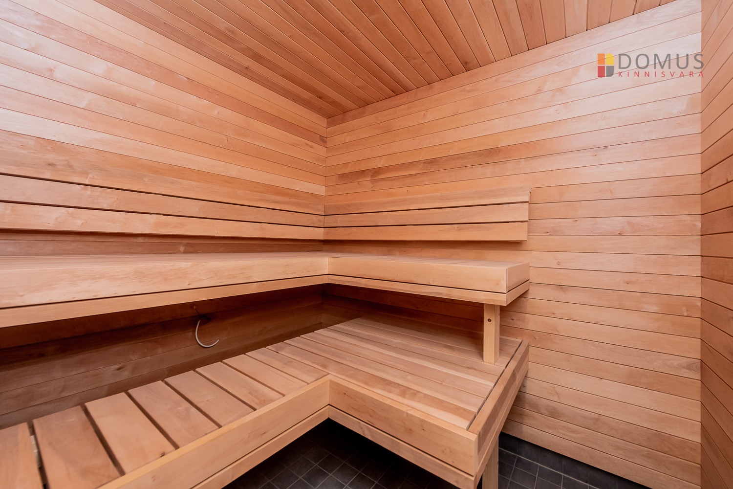 The 190.2 m² home features 6 rooms, an open kitchen area, utility room, walk-in wardrobe, sauna, shower room, 2 WCs, and a garage. Terraces at both the front and back of the house offer great outdoor space.