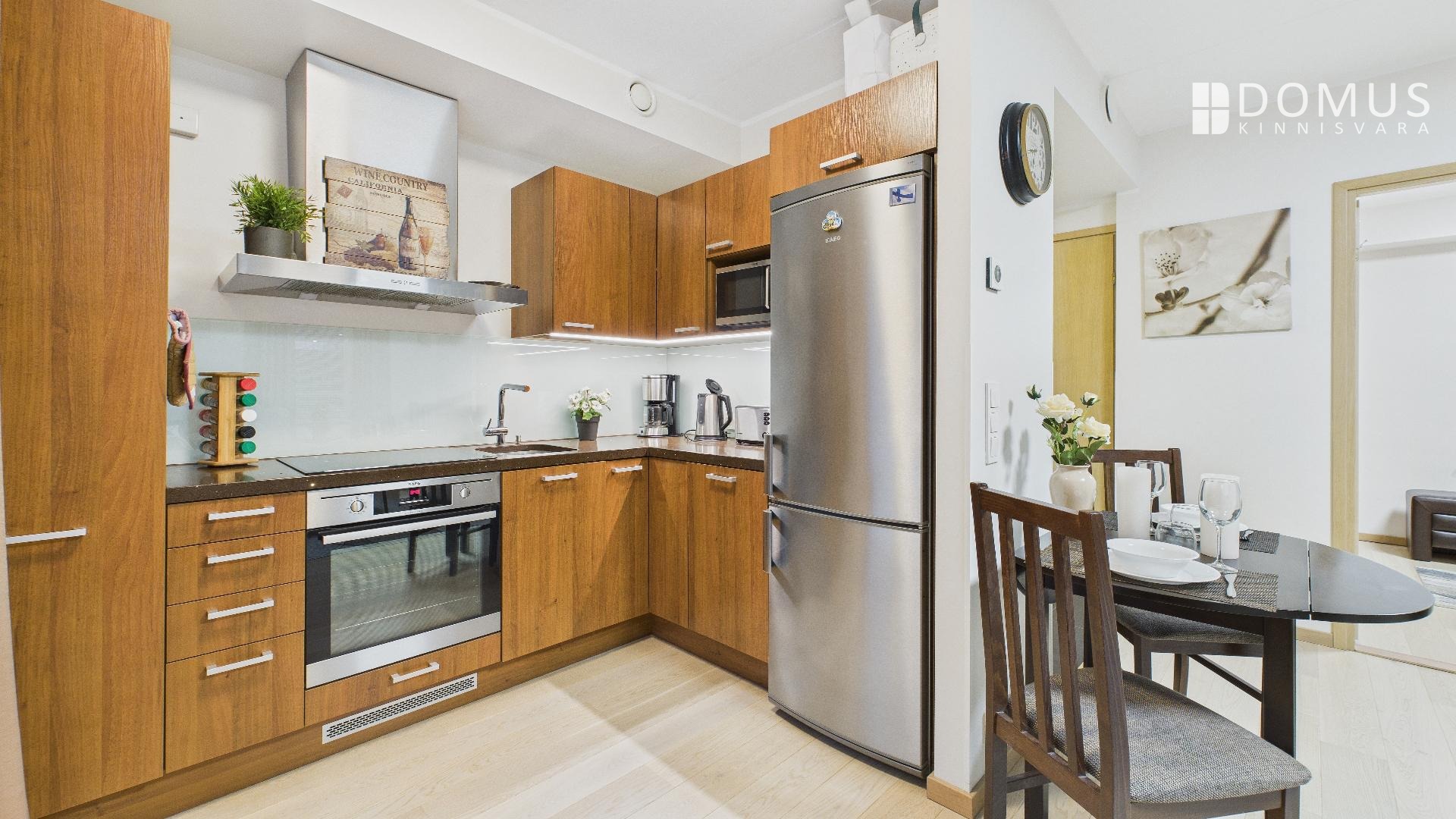 Both the bedroom and the entrance hall have spacious, full-height built-in wardrobes. The kitchen is custom-made and equipped with high-quality appliances, including an AEG refrigerator, oven, induction stove, and dishwasher.