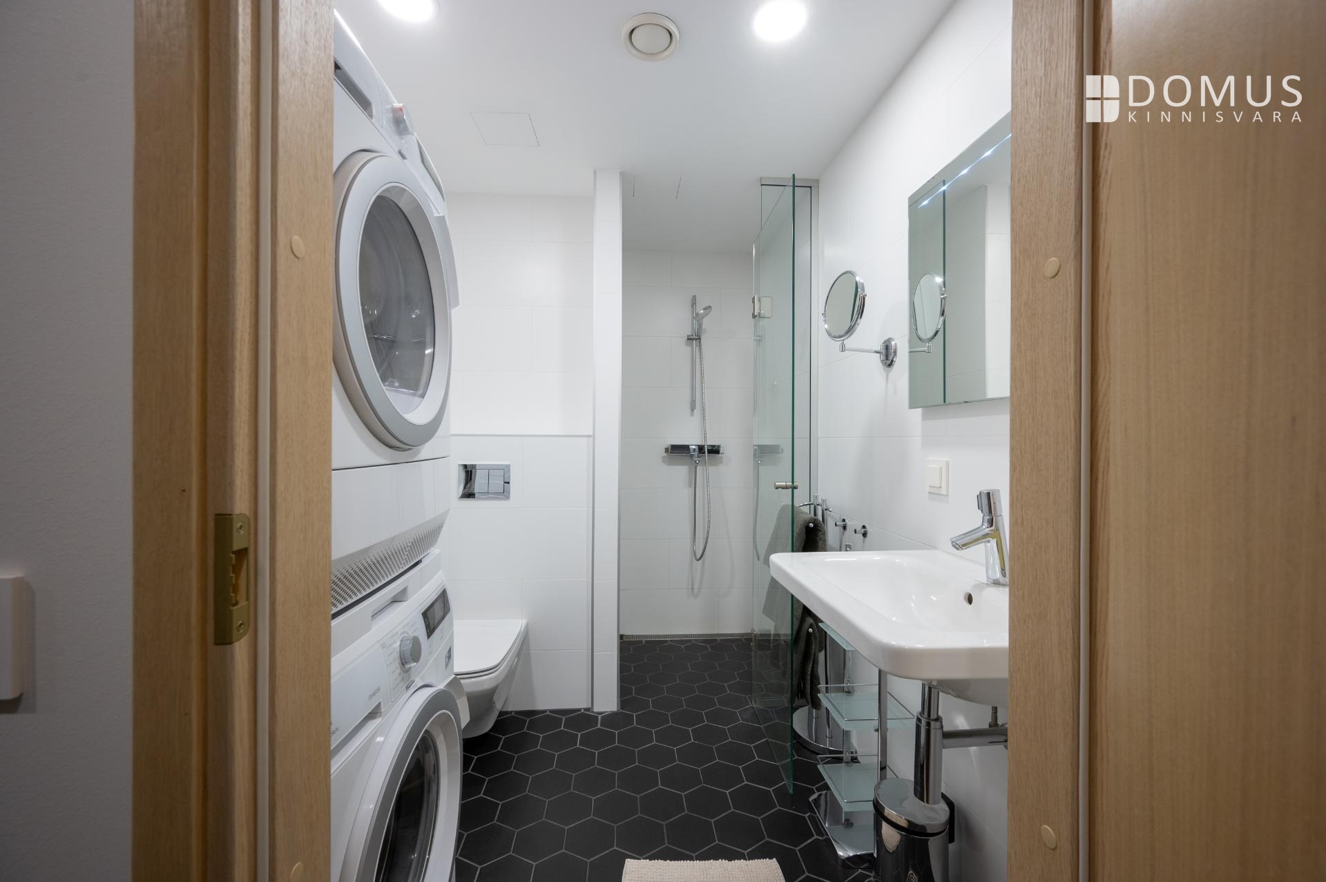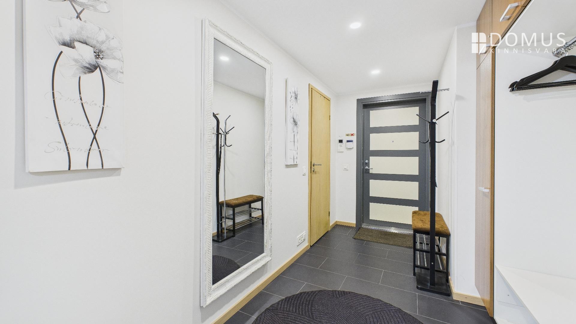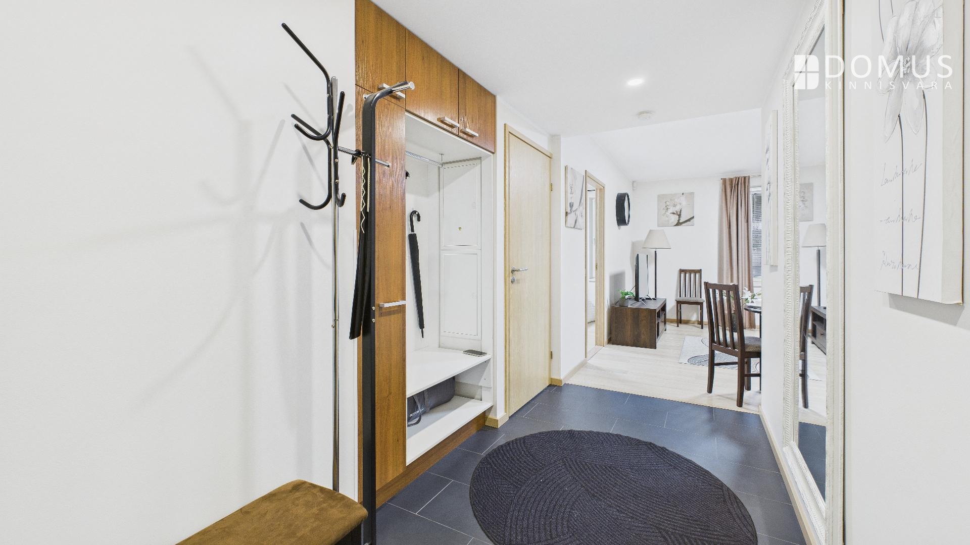 The apartment features heat recovery ventilation, with the ventilation unit discreetly placed inside a closet in the entrance hall. The bathroom also has a separate exhaust ventilation system.