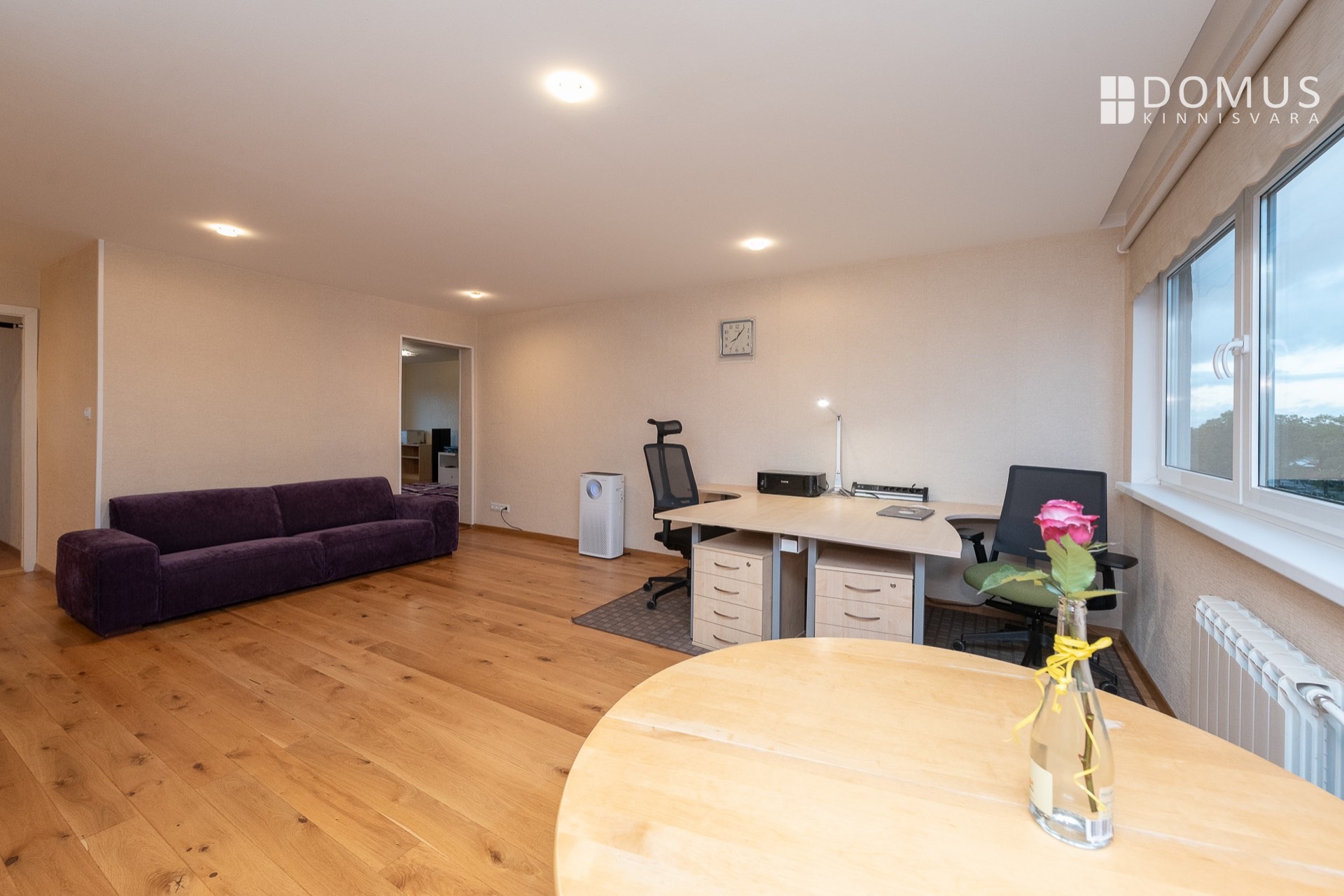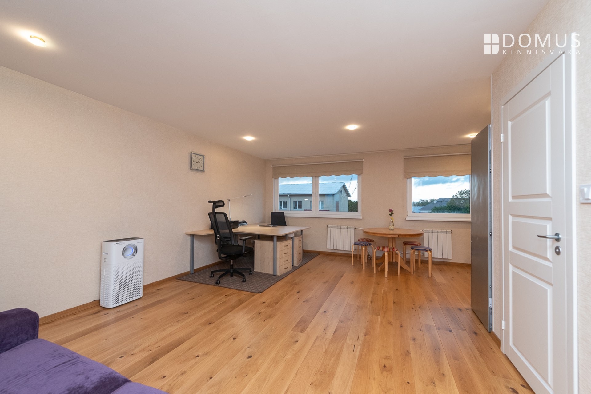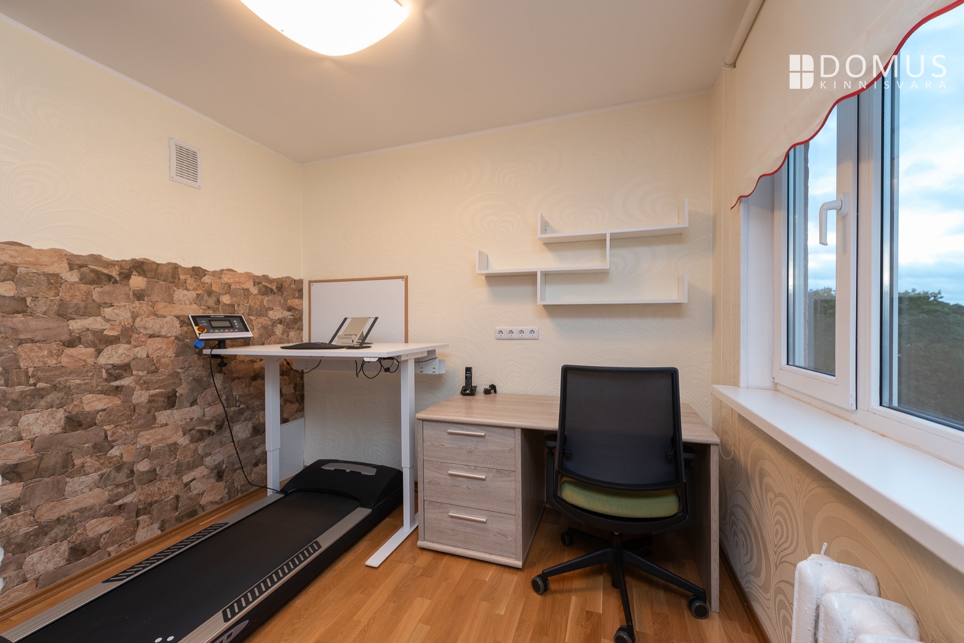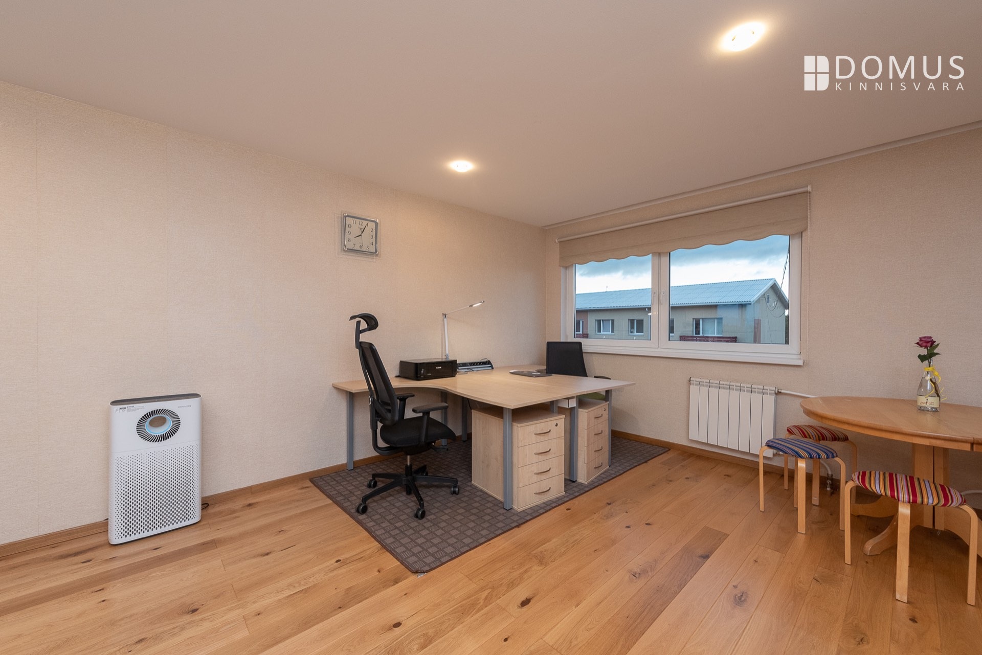 In the corner of the living room, the office desk has electrically adjustable height. A Walkdesk under the same desk allows you to get in your daily steps during phone calls. The living room also includes a Samsung 49" Smart TV (Ultra HD), a Yamaha receiver, a Pioneer CD player, and 180W Heco speakers. Additionally, Brother and Canon printers are located on the office desks, along with a Coway air purifier and a Heco humidifier.