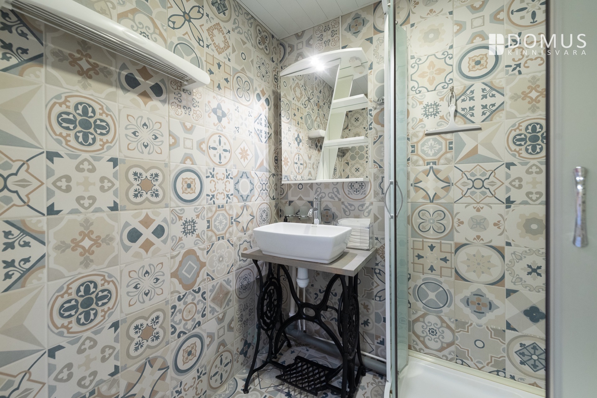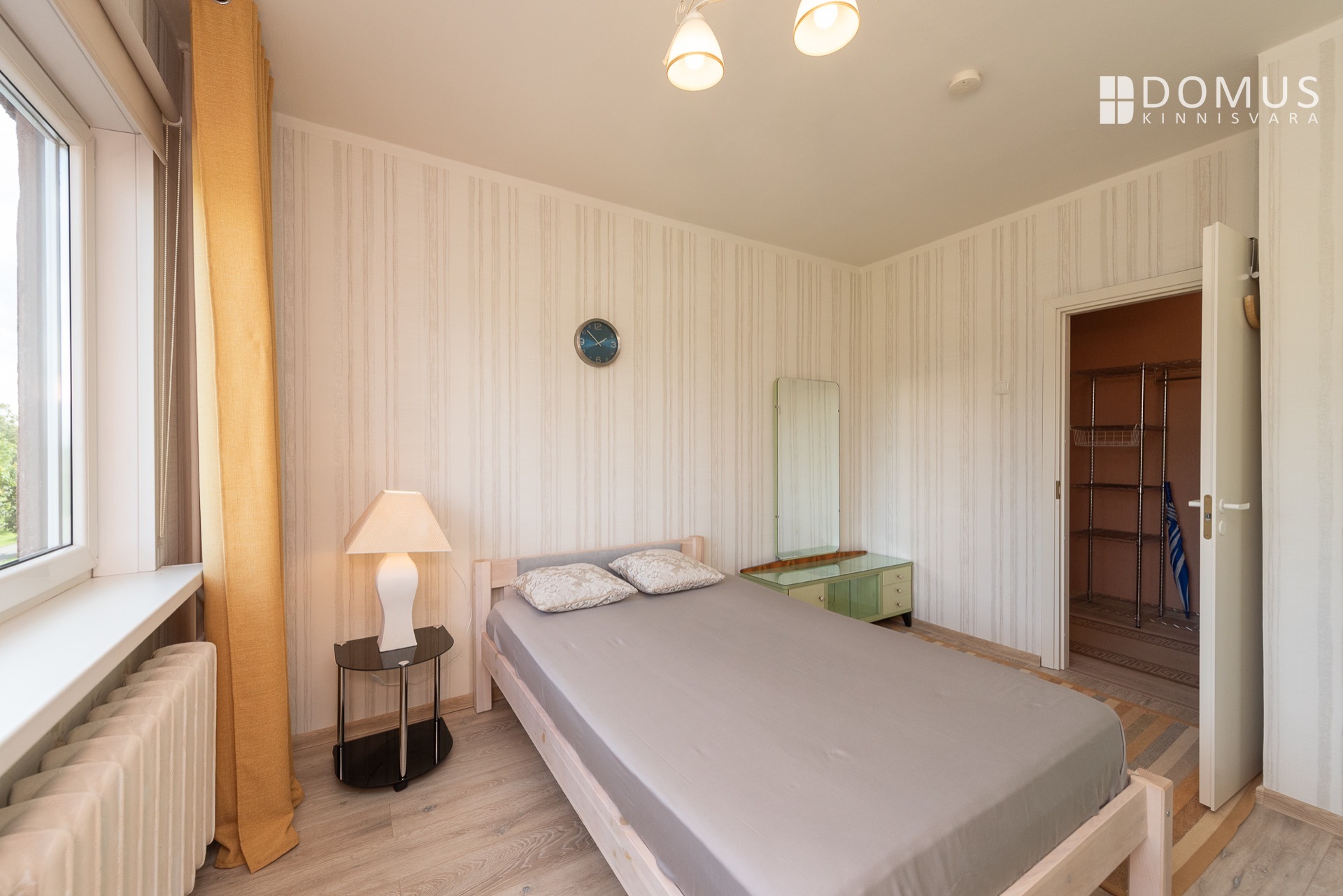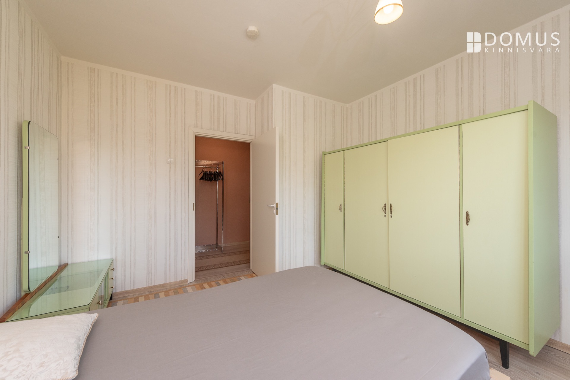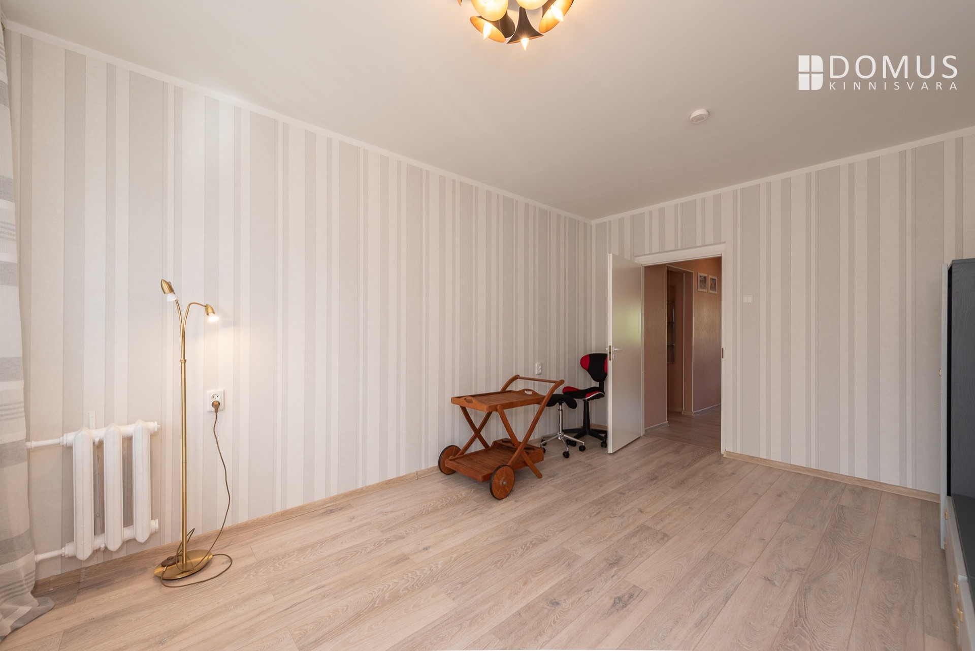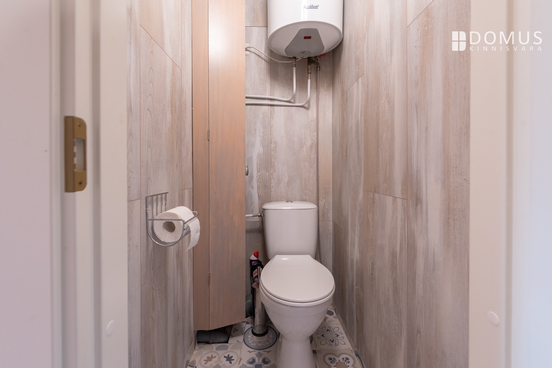The apartment consists of an entrance hall, bedroom, kitchen, shower room, toilet, living room, balcony, and a storage room in the basement. The floors in the rooms are covered with laminate parquet, and the walls are either wallpapered or painted. The ceilings are white. All windows have been replaced with plastic-frame double-glazed units. In the hallway, behind a curtain, there are clothes racks and shelves. The balcony at the back of the house has a drying rack, chairs, and a table for enjoying fresh air.