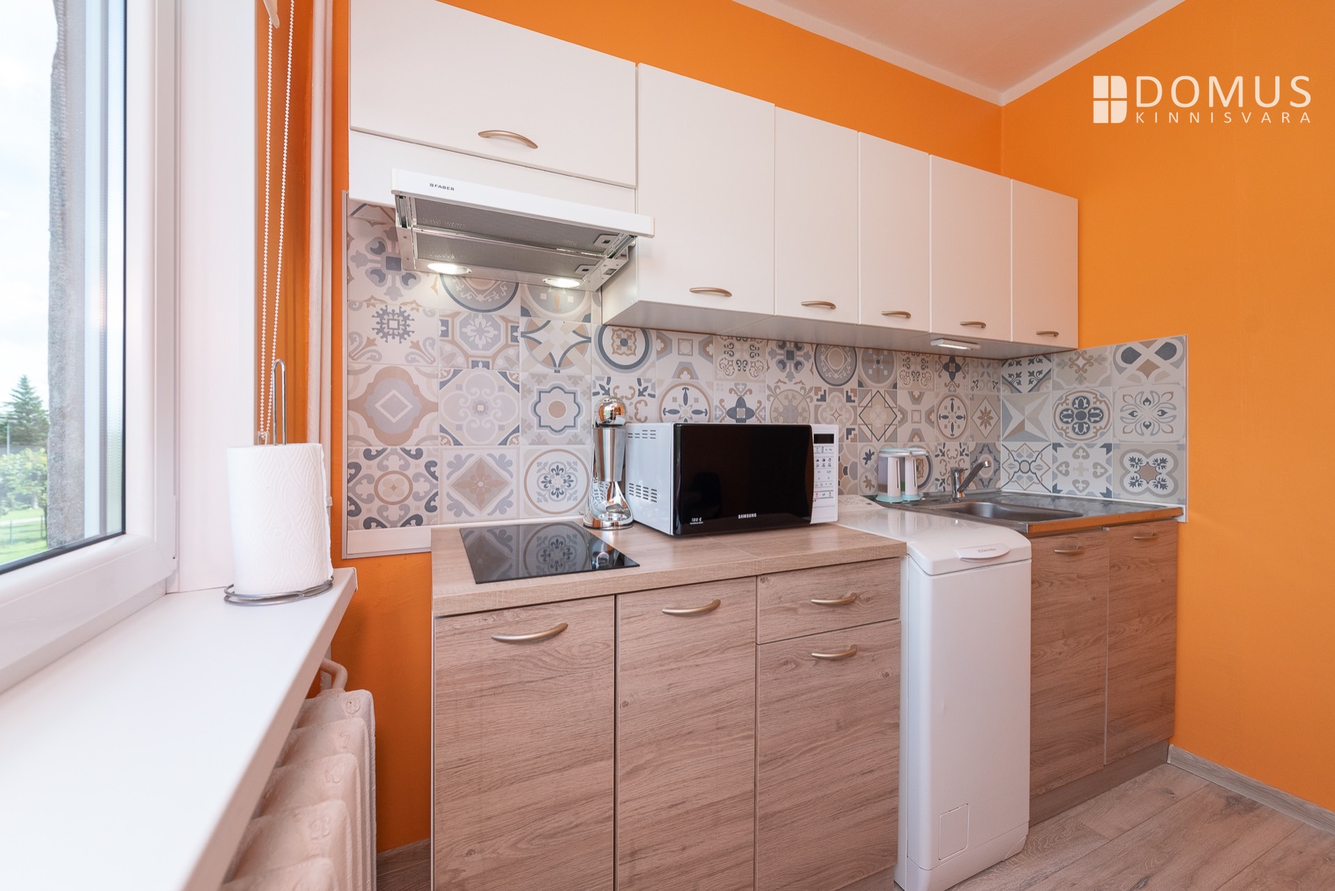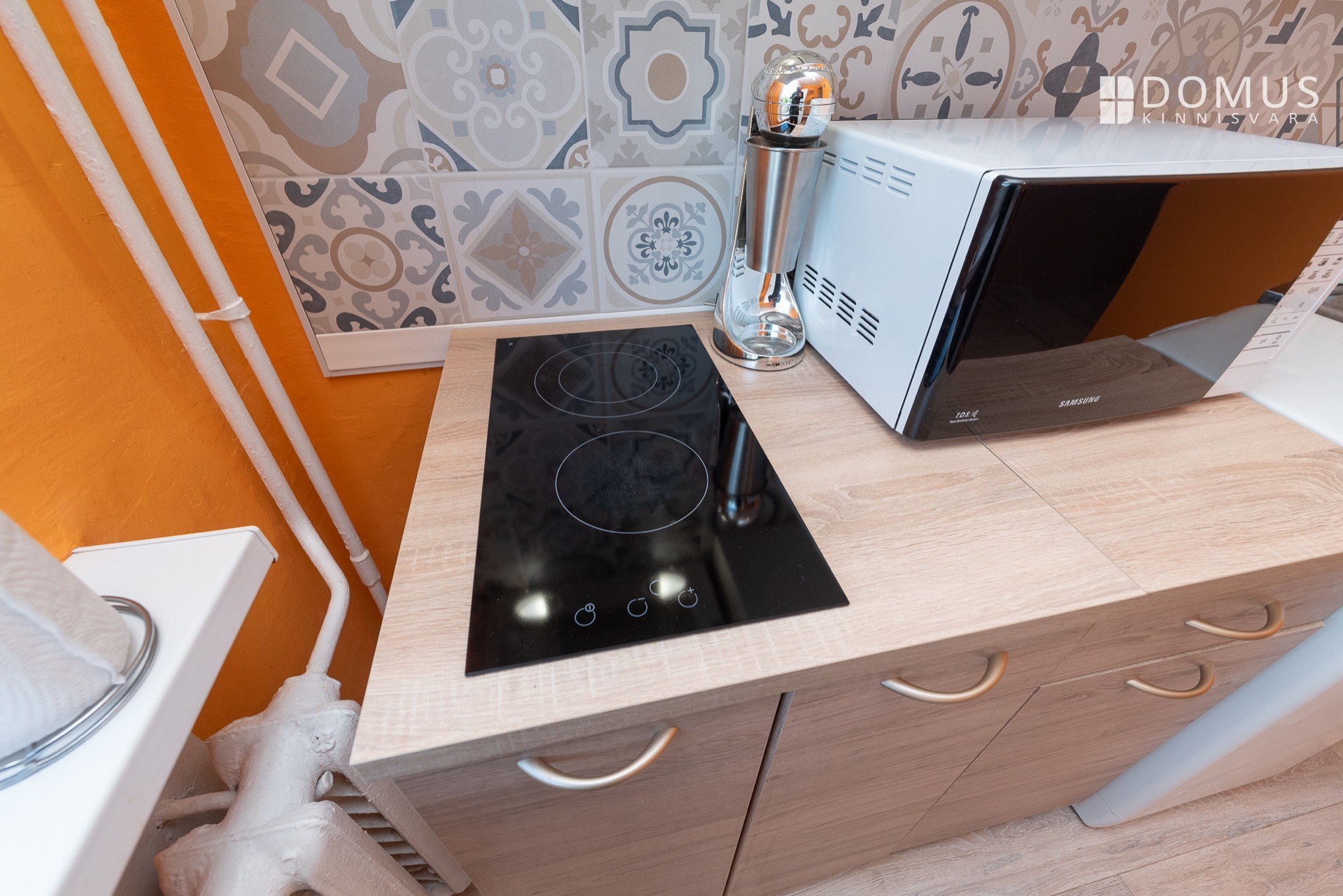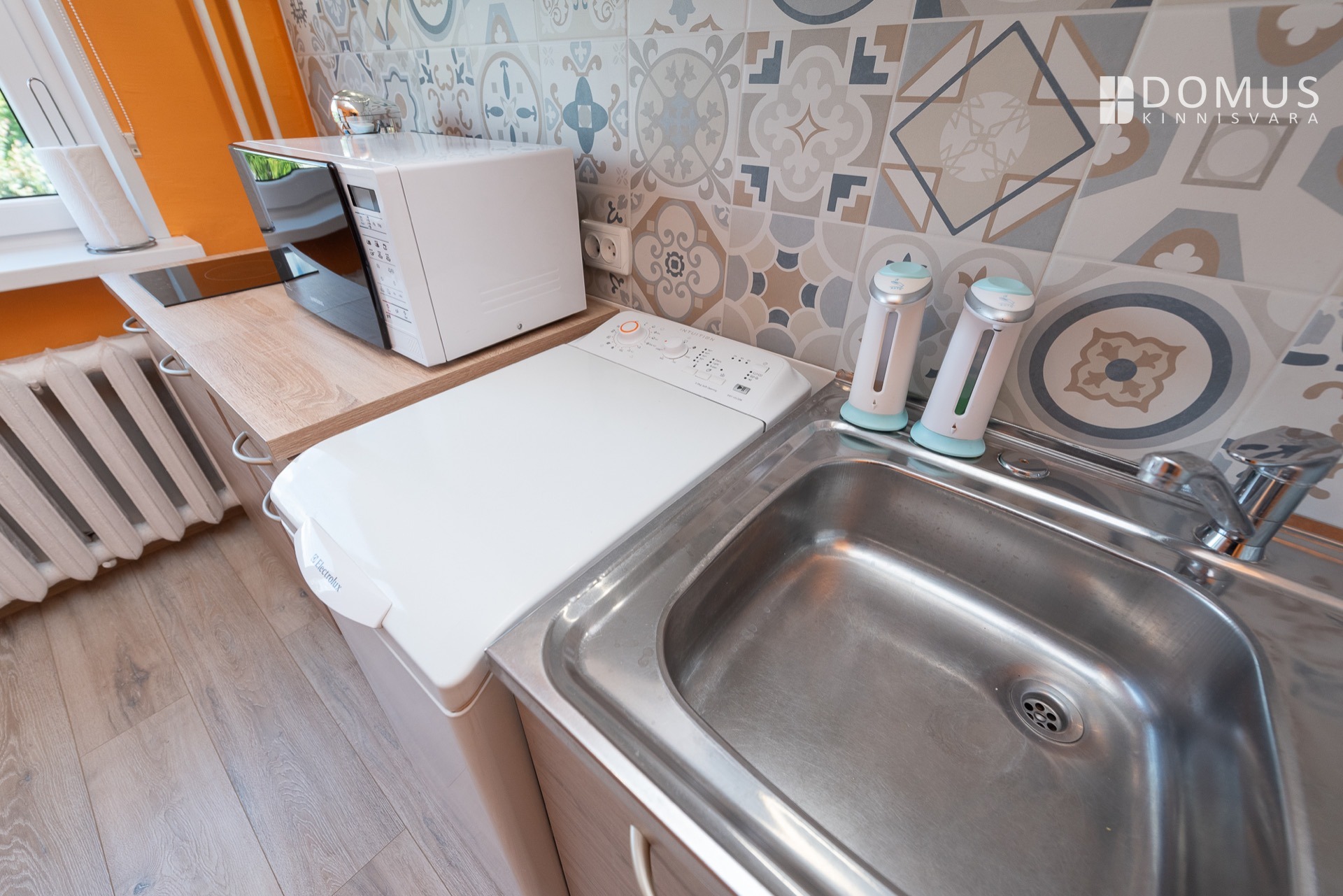 The kitchen is furnished and equipped with a refrigerator with freezer compartment, washing machine, microwave oven, ceramic stove with two cooking zones, dining table, and chairs. The shower room has a shower cabin and an electric towel dryer.