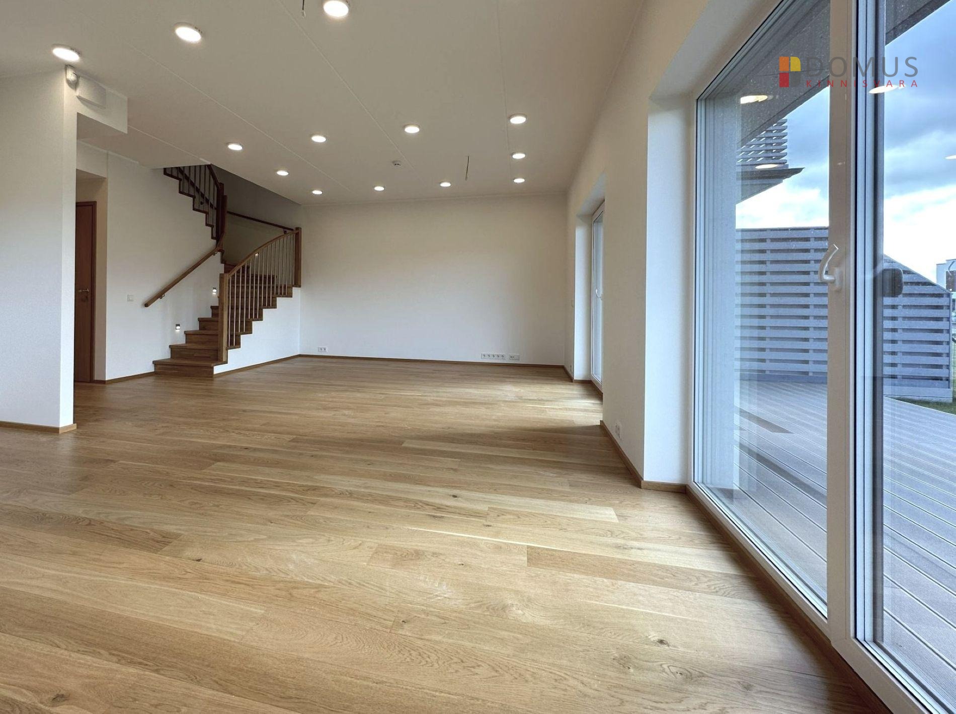 Interior finishes include high-quality materials. Ceiling lights are installed throughout. Floors are covered with single-strip natural oak parquet. A solid oak staircase leads to the second floor. Walls are painted in light tones. Bathrooms and WC are finished with ceramic tiles.