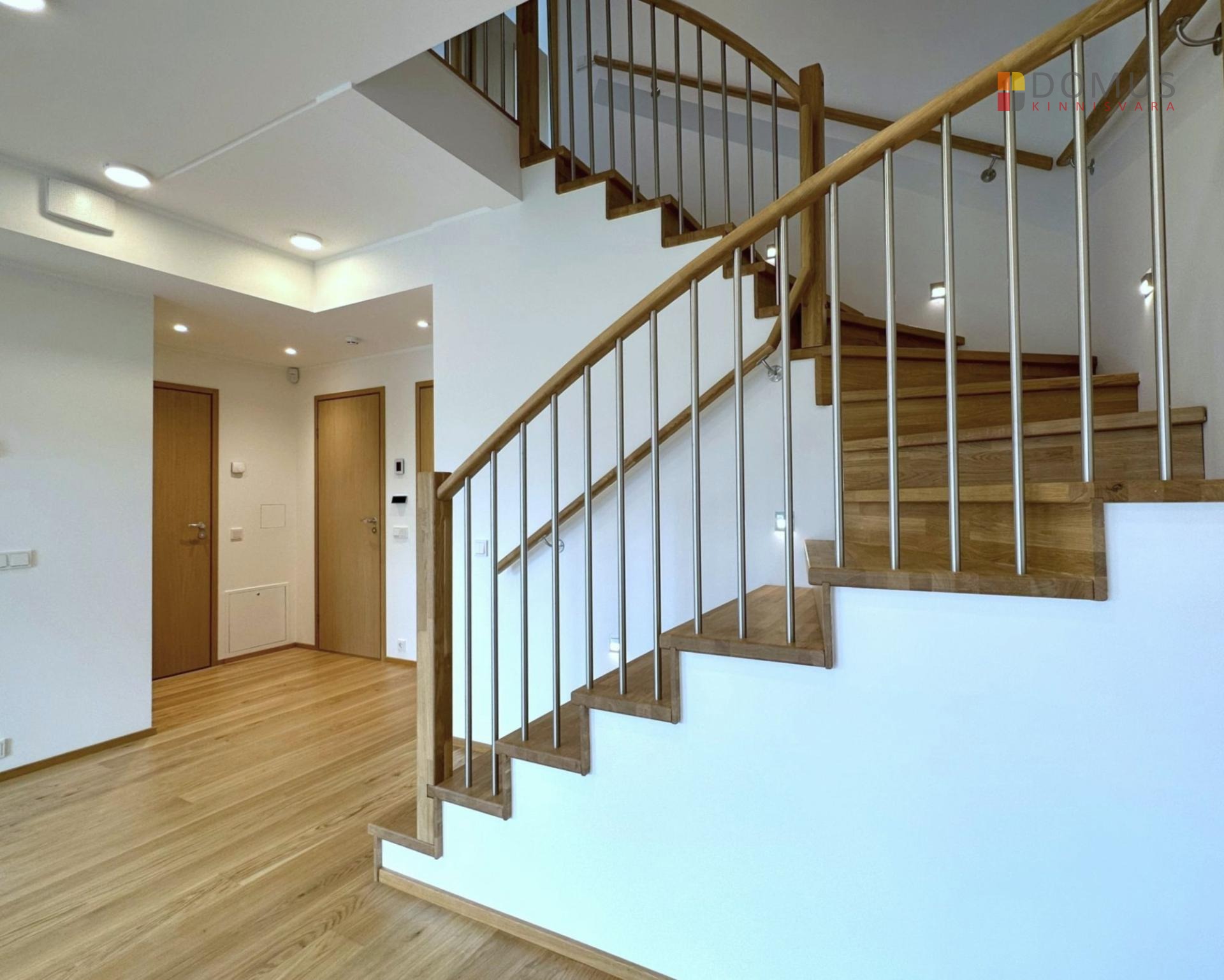 Installed kitchen furniture and appliances. Bathrooms come with sanitary ware, cabinets with mirrored doors and integrated lighting. All rooms are fitted with curtain rails and lighting fixtures. The entrance hall features a spacious wardrobe. The house is rented unfurnished.