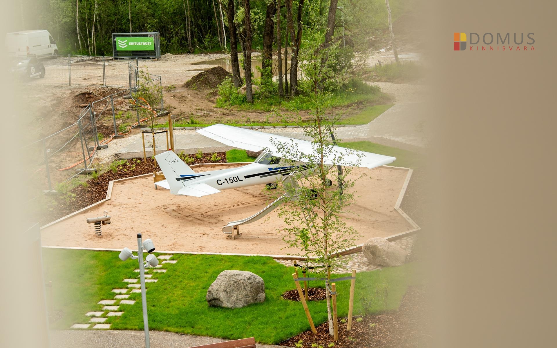 The residential area of Raadiraja Kodud is unified by a central public space featuring activity areas and landscaping. Playgrounds include a large sandbox area with various attractions, the most impressive being a plane. Additional amenities include community parcel lockers (https://picapac.com/).
