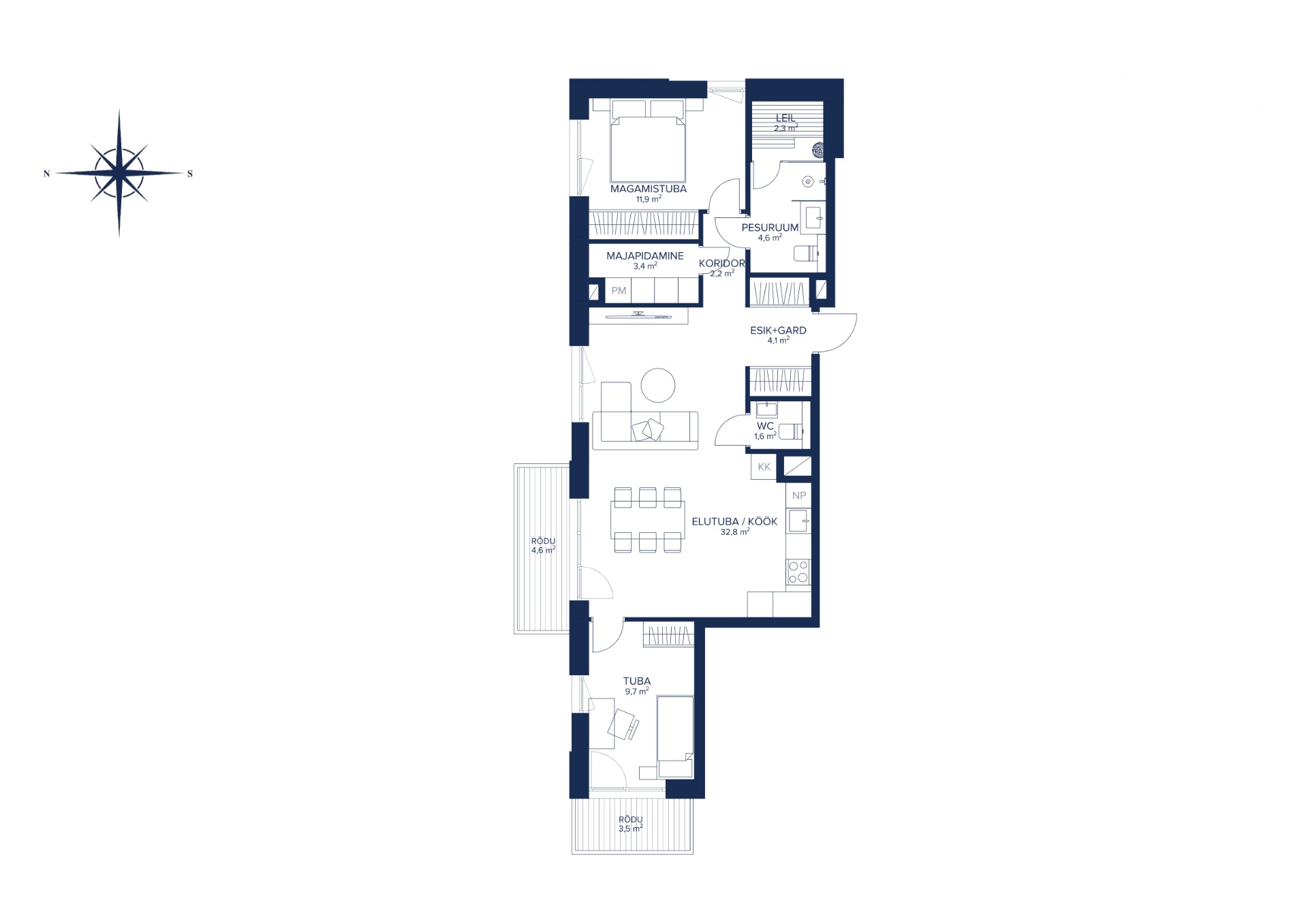 Two bedrooms (11.9 m² and 9.7 m²) located in separate zones ensure maximum privacy, and the smaller one has access to a 3.5 m² balcony with a view of the greenery and the setting sun towards the Emajõgi River.