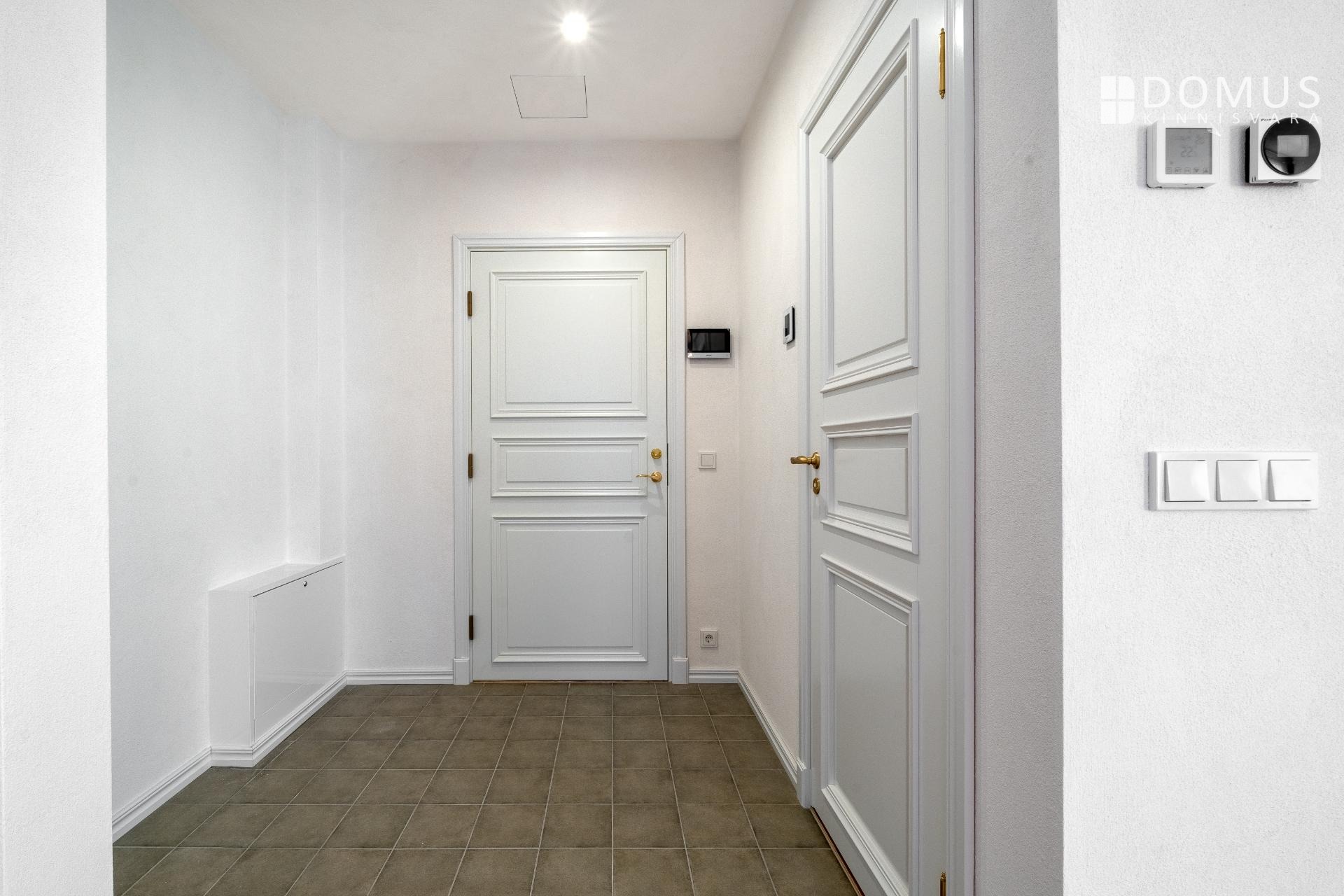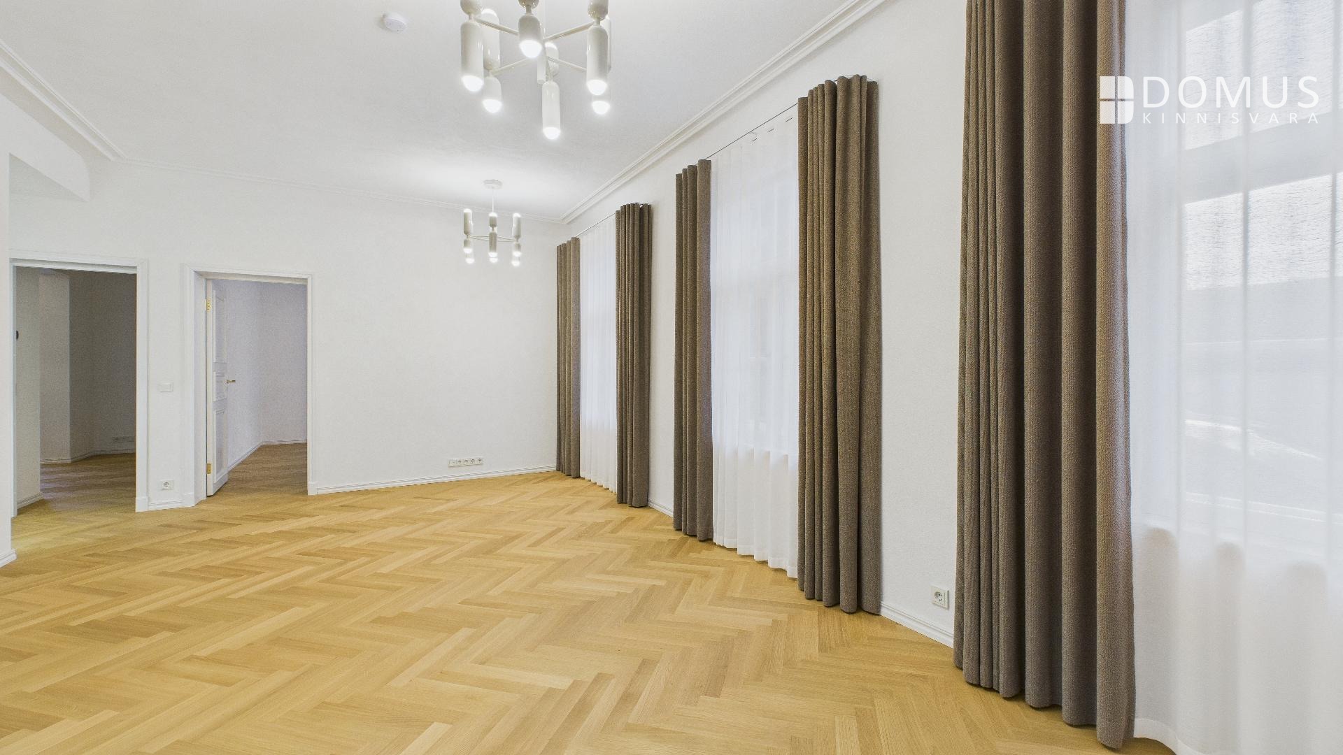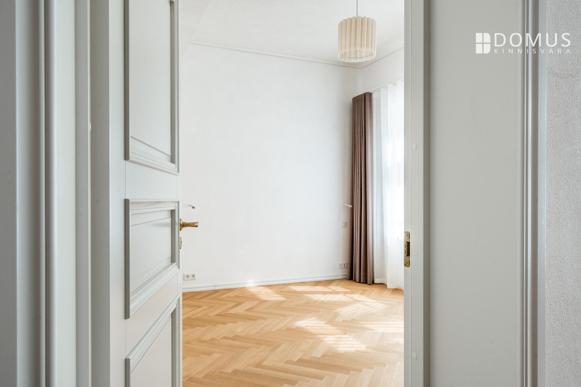 Selle korteri elutuba on algupäraselt olnud elamu kõige esinduslikum ruum – kõrge karniisitud võlvlaega elu- ja söögituba, lausa ca 3,2 m kõrge. Muinsuskaitsealusele majale väärikalt rõhutasime selle ajastut kvaliteetsete materjalidega tänapäevases võtmes. Puitparkett kalasabamustris, ehisdetailidega keraamilised plaadid vannitoas, naturaalne lubivärv seintel.